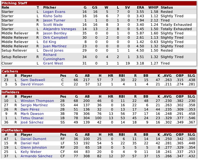 Just for a catch up, we have four players on the DL, three of which will return within a week, plus Itchy, who’s a story in himself. The possibility of me rage-quitting very soon again is highly likely. I’m more or less coming back since I can’t find something to play with for my life – it’s annoying. I was less choosy ten or even five years ago. I’m getting old (going hard on 27) and old people are constantly grumpy … well … that’s life. Ah. Raccoons (23-23) @ Thunder (21-27) Scott Wade opened the series for the Coons, falling to a homer by SS Tom Nicks in the first inning, which got the Thunder moving. They kept adding from there, and Wade was knocked out with force in the seventh. David Jones was unsuitable to keep runners left on by Wade from scoring and the Thunder took a commanding 5-0 lead in the inning. It was all the more commanding since the Raccoons didn’t get a runner on third base at all until then. Mark Dawson belted a solo home run in the ninth, breaking up Wilson Cordova’s shutout with one out, to become the only Furball to progress past second base. Raccoons lost shamefully, 5-1. Dawson 2-4, HR, 2B, RBI; Dadswell 2-4, 2 2B; Daniel Hall had overcome his back issues and was back on the team for game 2. Billy Mitchell was sent packing. Lefty Alejandro Venegas was on the mound in the middle game and fell behind in the first inning as well, but this time Tetsu Osanai was to blame, botching an easy grounder which could (and should) have been the third out. The error derailed into an unearned run eventually after two singles off Venegas. The first two Coons got on in the third, but were left right there. In the fourth, two singles and an error loaded the bags with Brownshirts and nobody out, but Venegas came to bat. He grounded to 1B Hector Roman, but still scored a run. Thompson got the Raccoons ahead with an RBI single, before Armando Sanchez rolled into an inning-ending double play. Bottom 4th: walk, two singles, bases loaded with Thunders and nobody out, and they took their two runs right back. The Raccoons had their next chance in the seventh with their first two men on, but the 3-4-5 batters then flailed in the most flailing ways imaginable. The Thunder sealed the deal in the bottom of the inning. Venegas left two on with one out, and Bentley waved them in, and the eighth wasn’t any better. Thunder rolled over Raccoons again, 7-2. Thompson 2-3, 2 BB, RBI; A. Sanchez 2-5; In addition to all the other misery, Dani Perez suffered an elbow sprain in the game and would be out for a week. Way to go. Game 3 had Carlos Gonzalez and Billy Robinson, two pitchers that had had great seasons before, but now combined for a 12.00 ERA. This game could only develop one way: two no-hit bids intact the first time through the lineup! The Coons struck first in the top 4th. Armando Sanchez walked ahead of Daniel Hall. On an 0-2 count, Sanchez was set in motion to at least take a shot at second base, but Hall unexpectedly connected, and well so, for a massive home run to dead center. It was the first of four straight hits for the Raccoons, who added two more runs in the inning. Gonzalez struck out to end the inning, then was shelled himself, and walked three in the bottom 4th, but a grounder to Thompson ended the inning with only one run in and the bases loaded. Hall came back to homer again in the top 5th, this time a 2-out solo shot. Bottom 5th. Error by Jose Sanchez, a walk to Jeff Wagner, and an error by Thompson to load the bases with one out. Gonzalez managed to run himself out of a 5-1 game with a 4-pitch walk to Dave Browne. Tim Moss came in, faced three batters, and three runners scored. Tied game, bases loaded, one out. Two more runs scored against Dirk Campbell. Thunder won, 9-5. Hall 2-4, 2 HR, 3 RBI; Dadswell 2-4, 2B, RBI; Raccoons (23-26) vs. Condors (29-21) Could Logan Evans get something going against a mightily powering team? NOPE. Three walks and a wild pitch in the first inning alone helped the Condors to an early 2-0 lead in the series opener. Evans had no control whatsoever over his pitches and walked six in an outing that ended in the fourth inning. Bottom 4th: Osanai singled, Dawson singled, Dumont singled, bases full, nobody out. Jose Sanchez flew out to right and Osanai managed to get himself thrown out at the plate. The Coons still managed to tie the game on an infield RBI single by David Vinson, and a pinch hit RBI single by Kelly Weber. Weber pinch hit for Bentley, who had been penciled in to cover innings, but now was out and Wally Gaston was sent out for long relief. He pitched two perfect frames, seeing the Coons take the lead on back-to-back doubles by Armando Sanchez and Daniel Hall in the fifth. Gaston’s third inning was bumpy and the Condors filled the bags with two down. Gaston to John Fleury – strikeout! Big Wally of old? Cunningham choked in the eighth and Grant West (who had pitched a pointless inning the day before, which came to bite now) entered for a 4-out save opportunity with runners on the corners and a 1-run lead. He got Jeremiah Carrell to ground back to West and the out was made at first base. West even had to bat in the bottom 8th with two down and Jose Sanchez on third base. He grounded behind first for an easy play that was still blown between Carrell and reliever Bob “Butcher” Haines (he of no-hit fame), West was safe and Sanchez scored. West put two on in the ninth, but saved it, 4-2, to end a 6-game skid. Hall 2-3, 2B, RBI; Weber (PH) 1-1, RBI; Gaston 3.0 IP, 2 H, 0 R, 1 BB, 4 K, W (2-0); West 1.1 IP, 1 H, 0 R, 1 BB, 0 K, SV (13) and 0-1, RBI; Sergio Martinez came off the DL and Joe Jackson was returned to AAA ball. So much winning, so much joy, so much rebound by the Condors, who socked Kisho Saito for five runs in the second inning in the middle game, aided by four walks, and he was chewed up for good in the fourth. Great, more strain on the pen. Bentley struck out Bergeron and Sakaguchi with the bags full 