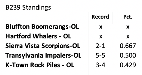 "Beating the spread" takes on a different meaning in Bronze 239. The OL teams are so spread out, there haven't been many games played. Here are the standings so far...