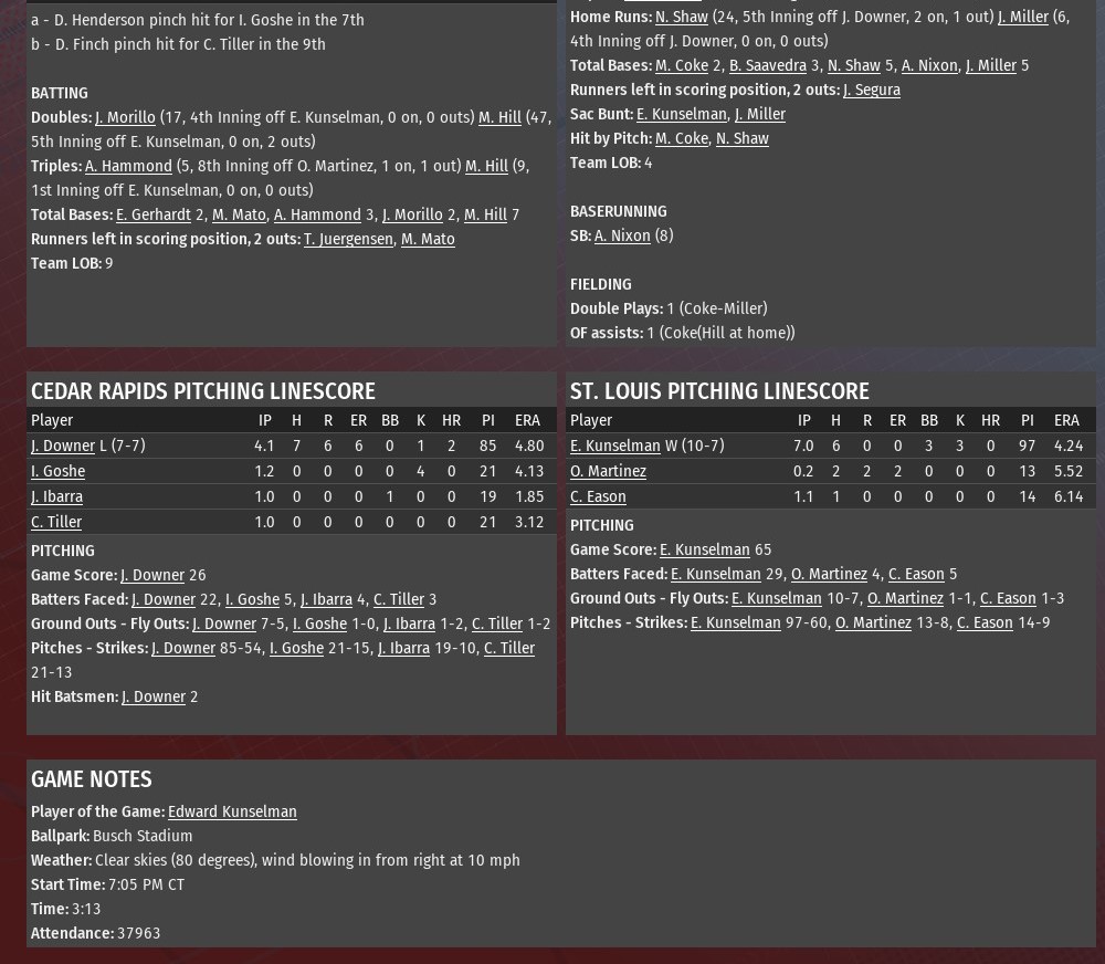 Edward Kunselman pitched six shut-out innings and St. Louis broke open a 1-0 game with five runs in the bottom of the fifth in a 6-2 win over Cedar Rapids at Busch Stadium (2006). The teams came into the series with Cedar Rapids holding a four-game lead over St. Louis with 18 games left in the season. The River Walkers' Jackson Miller opened the scoring with lead-off homer off Grapplers starting pitcher Josh Downer in the bottom of the fourth. An inning later, St. Louis put five its first six batters on base to start the inning against Downer, the one which didn't was a sacrifice bunt, as it took full control. Bob Saavedra had an RBI triple and later scored on a Jackson Miller single. Nick Shaw did the rest with a three-run homer. Kunselman (10-7) went seven innings, scattering six hits. He struck out three and walked three. Oscar Martinez got the first two outs of the seventh inning -- and also allowed both of the Grapplers runs, Arnold Hammond tripled to drive in a run and later scored -- before giving way to rookie Chris Eason. Eason finished the eighth and worked a 1-2-3 ninth to close out the win. |
