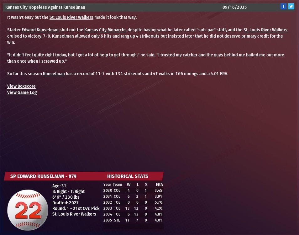 St. Louis starting pitcher Josh McDonald held Springfield scoreless on seven hits while tossing a shutout in a 2-0 win at Busch Stadium (2006). It is the second career shutout, his first coming back in 2031 when he was pitching for Ann Arbor. All seven hits McDonald allowed were singles. He struck out five and didn't walk a batter while throwing 109 pitches. The only runs of the game came in the bottom of the first inning off Railers starting pitcher Alan Albanese. Bob Saavedra led off the bottom of the first with a single. He scored from second on a one-out double by Jose Ramirez. Daniel Becerra later scored Ramirez with a two-out single. Last edited by rink23; 09-28-2021 at 05:07 AM. |