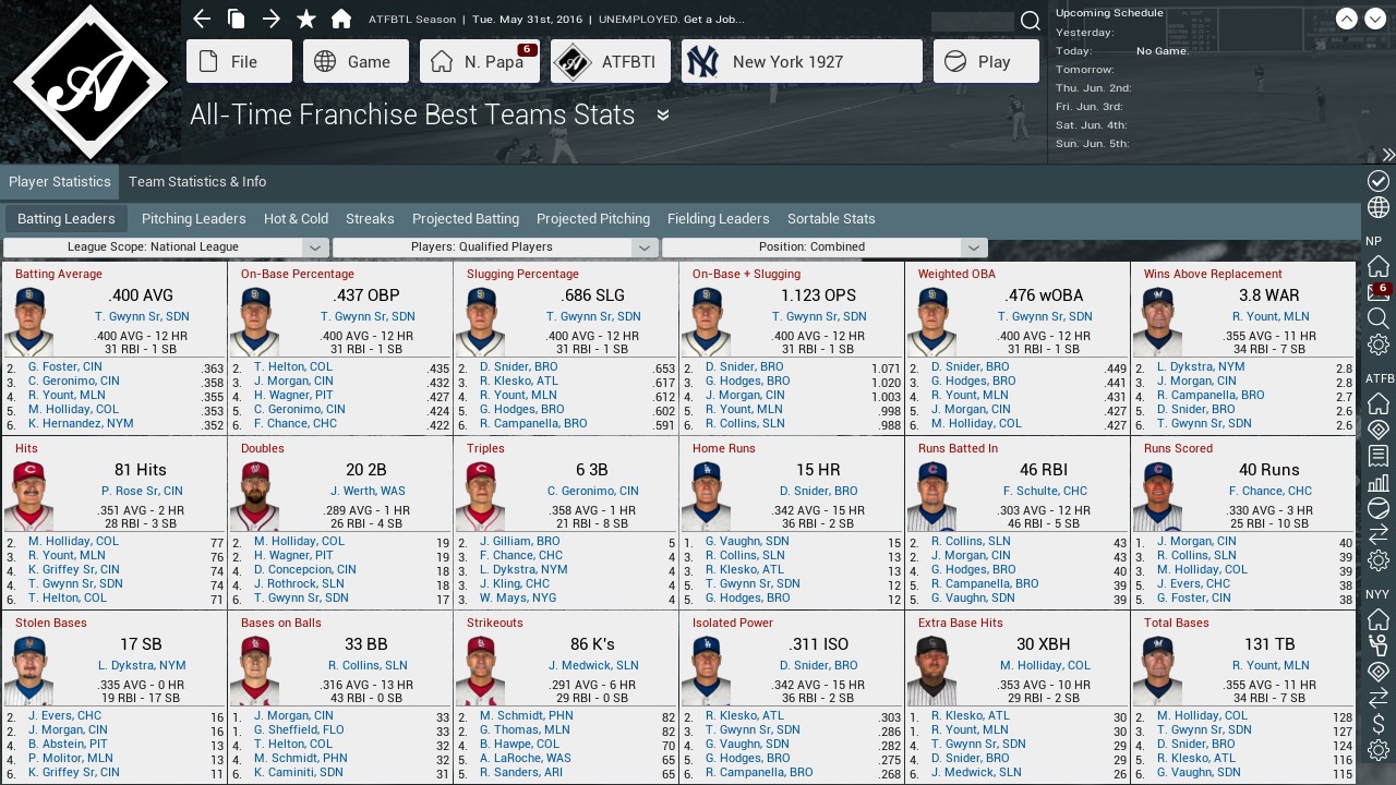 My list differs from someone else doing the same exercise, but I this is what I went with. Setting up the league to play the full 162 schedule, interleague play, AL DH rules (since 9 of the 15 AL teams played with the DH), no injuries, no minor leagues, no roster size limits. Had to pick a start date in settings for the AI to adjust for pitcher usage, etc. – split the difference and choose 1955 to try to strike a happy medium. Also going back to each team and adjusting rotation to 3, 4 or 5 man based on historical use. I am not sure how this will play out as I don’t know how the mash-up of eras will work with player usage but will give it a try – if anyone is interested I will post results as I go. |