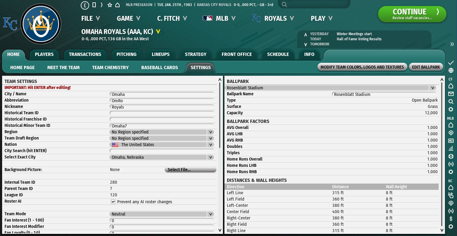 ![]() ![]() ![]() So far... so good. The game has been advanced to JAN 2, 1983 and the minor league teams with the changed franchise ID all had the team history carry over, while teams that were not changed lost their history. Even the Geneva Royals history carried with the GenevaNY3 ID. Just had to rename it and switch "Affiliation" from Cubs to Royals under NYPL Game Settings (LEAGUE SETTINGS > LEAGUE & TEAMS). Will be auto playing forward to next season to see if any issues come up. If not... (fingers crossed) thinking of just manually adjusting each minor league team ID same as was done for all the KCR ml franchise IDs. |