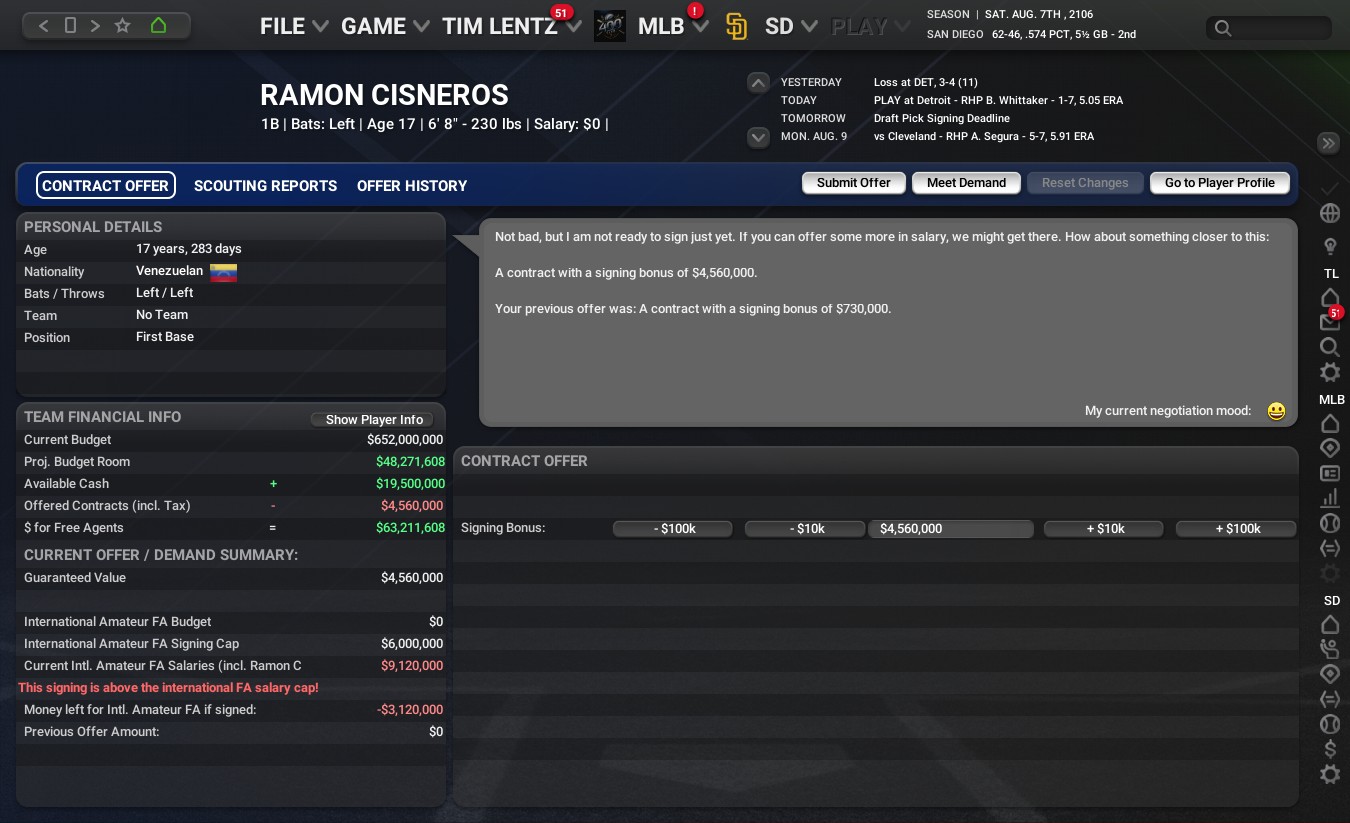 "So what do I believe? The inbox message, the pending screen, the contract offer page before I alter the deal, or the contract offer page when I change the amount I am offering. Cause they are all saying different things" This latest patch is a disaster and if it's not fixed then we're going to probably have to abandon our current league and figure out a different option for sim baseball. |