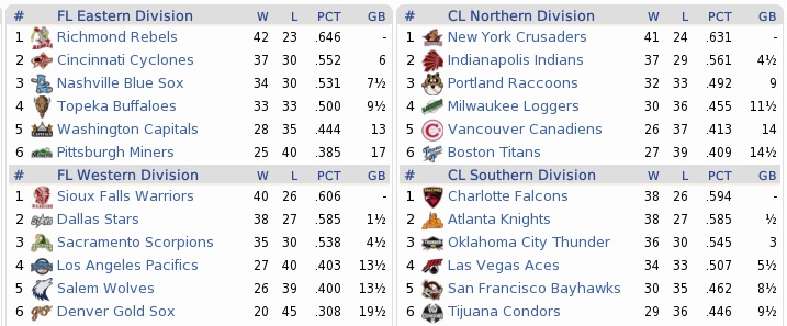 The luck ended right that evening. We got news that in an A level game our prospect Juan Martinez had torn his posterior cruciate ligament. He was out for at least nine months. We had signed him right out of Mexico this winter. We played game 2 without Ben Simon, who was a little worn out. Jeffries was in, but Simon pinch hit later in the game, grounding out. He has so far played in every Raccoons game in franchise history. The Raccoons lost 4-2 on poor offense and another shoddy performance by Christopher Powell, who gave up ten hits and all the runs in 4.2 innings. Next guy up with an inability to throw strikes as a recognized disability? Berrios. He walked four, but left a 2-2 tied game, that the Raccoons only lost through a combo of Wally Gaston walking three in the top 9th, combined with an Ed Sullivan error that cost three unearned runs. 5-2 loss. Sullivan deserved a day off along with Maloney, and both saw the Raccoons lose in ten innings, 2-1, with once again four hits. Logan Evans got a no-decision again with one run allowed in seven frames. Now, allowing only 11 runs to the Crusaders over four games, that was certainly not that shabby. Of course, it was almost all bullpen. Berrios and Powell were in a slump, and Evans was walking them in scores. And then the team scored only nine runs themselves, losing three of four. I realize I continue to sing the same song here. But at 36-45 now, the first half of the season was over, and we were 262-329 in runs. That’s actually just over three runs scored per game. We were relying heavily on the long ball, leading the CL in home runs. Almost every other offensive category (including steals with Flores losing his timing): 11th or 12th. Canadiens in Vancouver for four games next. Jorge Romero went six good innings allowing one run and Hoyt Cook later bashed the go ahead home run in the top 9th. Hatfield got his 23rd save in the 2-1 game with an amazing catch by Pedro Sánz to end the game, but then was in pain afterwards. He had a sore shoulder and was out for for one to two weeks. Which was terrible. One week, keep him and play Gaston as closer. Two weeks, disable him. One to two weeks? Gnarf. I thought about disabling him and calling up Brett Justice, but Justice was still struggling after a year on the DL, so I got Ned Ray to replace him in the pen. Gaston would close the next 15 days. There was no save opportunity the next day, when the Raccoons beat the Canadiens 6-2. They only had five hits, but were walked eight times and Ben Simon got the ship righted early with a 2-run slam in the first inning. This was followed by a 7-3 win the next night. Berrios one-hit the Canadiens in five innings, then crumbled in the sixth and couldn’t get out of there. Tony Lopez actually got his first career save, pitching the last two, entering at 5-3, before Flores homered in the top 9th. Flores, Sullivan, and Simon all had three hits. Maybe things were just slightly coming around. The Raccoons finished the four games in Vancouver with a sweep, rapping Canadiens starter Vic Underwood hard for seven runs in four innings, winning it 9-2. Logan Evans: 6.0 IP, 5 H, 1 R, 0 BB, 5 K. The kid was sometimes erratic, but this was a stellar outing for him. A warm wind was blowing through the clubhouse. Rapping the Canadiens by 24-8 runs and sweeping them in four had helped a lot to rebuild lost confidence. Sure, we had temporarily lost our closer, but the good thing was that the All Star break was up – three off days either way. Of course, it was bad for Hatfield, who, leading the ABL in saves, might have had a shot at a selection. Only the Titans left for three in Boston before the Federal League and Continental League would match up. A few guys got a day off to start the series, with Pickett and Jeffries in for Flores and Swift. Jorge Romero went the distance in game 1 as the troubled Titans pitchers were rolled up by the Raccoons, 8-1. Everything went right out of whack again from there. Boston’s Sean Critch shut down the Raccoons, while Christopher Powell continued to throw like a girl. Six runs in two plus innings, that guy was about to get shafted. Raccoons lost 9-0. Game 3 was more of the same with a 6-1 loss. Raccoons were fanned nine times and Berrios pitched five scoreless before melting down epically in the sixth. Ben Simon was the only Raccoon nominated for the All Star game. The Continental League won 3-0. Simon played the whole game at shortstop, but went 1-4 with 2 K’s. Break over, back to business. At 41-47 and very erratic play this meant to try to optimize the lineup. Dolder was out, batting below .200 and not getting plays in several times against Boston. Pickett was in CF against the Canadiens, in another four game series, this time at home. Logan Evans started the series at home and allowed two runs in the first inning. He then settled in, but the Raccoons didn’t score for him and only got moving in the bottom 8th with three runs scored by the bottom of the lineup. Gaston got his first save in place of Hatfield (second overall this season) in the 4-2 win, but walked two again – this was why he was not the normal closer for the team. Lack of control. Next game, lack of everything in a 4-1 loss. Once again only four hits, a common theme this summer. Game 3. Powell was given a 1-0 lead, but blew it. The Raccoons trailed 3-1 in the bottom 8th, with the bottom of the lineup loading the bases, and nobody out. Flores flew out, Sullivan flew out, Sánz singled in one, Simon flew out. It was both pathetic and embarassing. They loaded the bases AGAIN in the bottom 9th with one out and didn’t score at all, Johnston was thrown out at home while trying. For crying out loud!! They put up at least one strong inning in the last game for a 4-1 win and a tied series. In other news: July 2 – Harry Beauman (.314, 6 HR, 34 RBI) of the Pacifics is out for six weeks with a fractured rib. July 4 – The Indians trade Jorge Vallejo (9-8, 2.99 ERA) to L