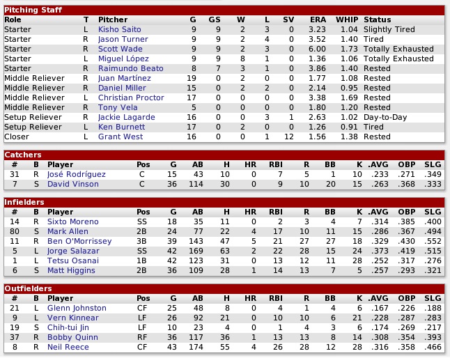 Northwestern Knockouts, Part Deux. Somehow I had a feeling who’d be knocked out. Bobby Quinn would miss this series with his thumb issue and we would play a man short. Kisho Saito’s inability to remove batters in 2-strike counts didn’t get any better with the season on the line. CF Ronald Moore crushed a home run off him in the second inning before things became really nasty in the sixth, where the Canadiens had several extra base hits, hit in 2-strike counts. Saito was saddled with four runs in his six innings, further raising his ERA, while the Raccoons were wholly and completely overwhelmed by the pitching death star that was Arnold McCray, who did yield very little in the first eight frames: four hits, one run, and there the Raccoons got help from Michael McFarland misplaying a fly ball in right field. Lopez and Reece led off the bottom 9th, 5-1 down, with singles that knocked McCray off the mound. Julián Gonzales came in and walked Higgins. Bases loaded, no outs, tying run coming up in Vern Kinnear. Gonzales partially emptied the bases with a wild pitch, then loaded them again, walking Higgins. Glenn Adams struck out, but Vinson lined into shallow left for an RBI single. 5-3, bases loaded, one out. Moreno pinch-hit for Juan Martinez and popped out. Salazar grounded out to Gonzales. 5-3 Canadiens. A. Lopez 3-4; Higgins’ speed and his 23rd stolen bag of the year, coupled with an error by McFarland, gave the Raccoons an unearned 1-0 lead in the first inning of game 2, where Turner matched up with Vernon Robertson. The lead – as unearned as it was – didn’t last long, as the Canadiens came back to tie it in the second inning, and Turner threw a wild pitch for the go-ahead run. Bottom 4th, Adams on second base, one out, Hall came up. He had yet to drive in a run in July, and lined into deep left – and Kevin Gilmore caught the hissing bitch. Adams was left on third base in the inning, and the Raccoons only tied the game in the fifth with a leadoff homer by backup catcher Rodriguez. Turner pitched into the seventh, when he was removed in the tied game with two out, a runner on third base, and left-hander “Itchy” Ishizaki pinch-hitting for Robertson. Burnett struck out “Itchy”, and would turn up as the most tragic figure on a roster full of them. He was left in to collect the final out in the Raccoons’ seventh, but instead walked against Munemori Suzuki. O’Morrissey singled to right, and Higgins walked to load the bases, before Lopez popped out to waste another chance. Burnett faced Raúl Solís to start the eighth, and failed to keep him off the bases, as Solís laid down a bunt and beat out the play at first. Lagarde replaced Burnett, walked McFarland, then walked David Brewer with one out, and finally drilled and injured Ronald Moore, pushing in the go-ahead run for the Canadiens. Daniel Miller and Neil Reece, who threw out Brewer at the plate on the next play, held the damage to two runs total. The Canadiens then suffered their own bullpen explosion in the bottom 8th, as Suzuki put on two for Daniel Hall, who popped up a 3-1 pitch for the first out. Salazar walked, and Rodriguez hit an RBI single to right. Kinnear pinch-hit for Miller, prompting the Canadiens to bring their own Alejandro Lopez, a left-handed reliever, who still surrendered a 2-0, 1-out, 2-run single. Higgins scored Rodriguez, giving Grant West a 2-run lead in the top 9th. West walked the leadoff man and threw not one, but TWO wild pitches in the inning, before Neil Reece made a fantastic grab for the final out with the tying run on second base. 6-5 Raccoons. O’Morrissey 2-5; Reece 2-4; Rodriguez 2-3, BB, HR, 2 RBI; Kinnear (PH) 1-1, 2 RBI; Turner 6.2 IP, 5 H, 2 R, 2 ER, 0 BB, 3 K; Lagarde was shot and buried on the center field side of the mound. He’s not getting anything done at this point, which is true for about three quarters of the roster. Manny Ramos was the weakest link in the Canadiens’ rotation, while Scott Wade’s ERA was still highest for the Furballs, although Saito was catching up incredibly fast. The Canadiens struck first with an Edgardo Ramos home run, but Matt Higgins matched that, both in the second inning. The Coons even took a 2-1 lead and were up 3-1 with the bases loaded and one out in the bottom 3rd. The strugglers Kinnear and Allen came up and reliably ended the inning, although Kinnear at least managed a sac fly. Allen struck out. Manny Ramos was knocked out in the fourth after a 2-run single by Higgins, and the Coons were up 6-2, with Higgins a triple away from a cycle. The Canadiens however were by no means defeated. Solís cut the deficit back to two with a 2-run shot off Wade in the fifth and Alejandro Lopez had to throw out Brewer at home to end the inning. But while Wade was not stellar, the Canadiens’ bullpen, which was not top level to begin with, came completely apart in the bottom 6th, where the Raccoons extended their lead to 11-4. Wade went into the eighth in a not quite great outing, but he survived the Canadiens in one piece. 11-4 Raccoons. Salazar 2-5, BB, RBI; O’Morrissey 3-6, 2 RBI; Higgins 3-5, HR, 2B, 3 RBI; Hall (PH) 1-1, 2B; The Canadiens had a runner thrown out at home for the third time in the series in the second inning of the final game. Too bad that by then they were already up 3-0 on Miguel Lopez due to a Javier Salcido home run and then two unearned runs following a Mark Allen error. Daniel Hall retrieved two runs with his first RBI hit since June 30 in the bottom of the inning, a 2-run home run against Ruben Prado. Salcido homered again in the top 3rd, but the Raccoons swung the game around in the bottom 3rd with a 2-out, bases-clearing double by David Vinson, who subsequently scored on a Kinnear single. Prado was knocked out. The next three innings remarkably remained scoreless, culminating in Allen getting thrown out at home to end the bottom 6th to keep the score at 6-4. Like Wade the day before, Lopez ended up going 7.1 inni