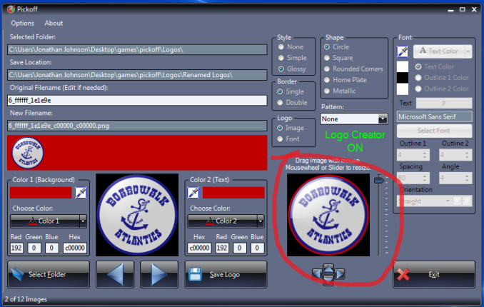 First create your logo in the color you want and give it the border color of your choice. (Select simple instead of glossy for now). Then save it. Next reload the logo like you would any logo. Then select a color for color 1 and 2. After that, resize the logo and you'll have a two color border. Alternatively, you could even make color 1 and 2 different colors and have a three color border. Now select glossy, if you want, and save the logo. Sample... Last edited by DreamTeams; 09-11-2014 at 01:19 AM. |