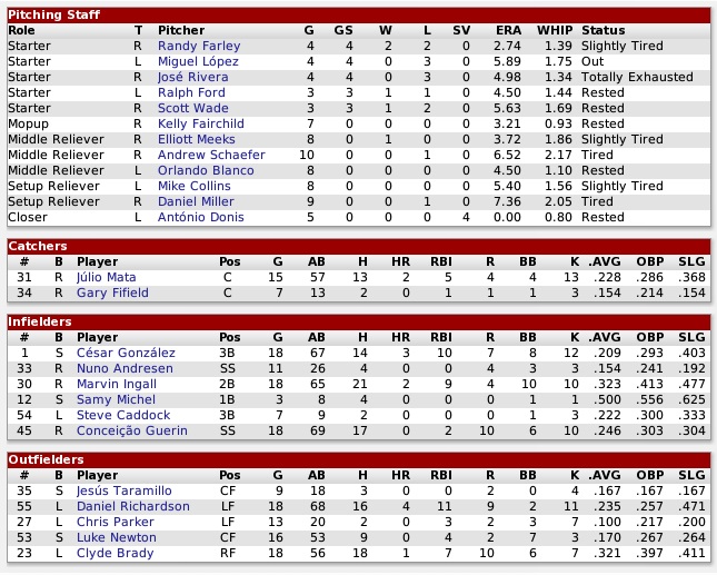Also, in a twist of events, world news and the complaints and stuff section will front this update. You will understand come Sunday. Complaints and stuff Today in your favorite soap opera “Bad News from the Coons Farm”: SP Nick Brown has suffered a ruptured ulnar collateral ligament. No 11th round to the majors, at least not this year, and with the time frame for recovery of “one year and up”, it may not be next year either. Why are we even trying …? Our old friend Jason Turner was on waivers early in the week, as he was pitching to a 1-3, 5.77 ERA tune this season. The Pacifics were using him in a swing man role, something I don’t think he’s made for, and he was swamped completely by a .405 BABIP. Although I would love to make an upgrade over Rivera in the rotation and to get our old friend Jason back home, I’m afraid we can’t swallow the $1.06M he’s due or rather the share of that for the remaining 4 1/2 months of the year. Our budget room was projected to be $548k at this point, and we haven’t drafted yet. Anyway, he was not claimed by anybody and assigned to the Pacific’s AAA team, the Loganville Bombardiers. Neil Reece wants to talk contract, which makes me squeal like a happy piglet. However, I fear he might want many millions… He’s gonna be 34 next year, but I think we might be safe on a 4-year deal. I wouldn’t want to go higher, though. Moneywise, I fear we might have to part with up to $6M to get this deal done. Given the escalating salaries all over the league, $5M would be cheap. No idea where I would fit $1.5M into the budget next year. It is *actually* only $400k more than he makes now, but you know Uncle Scrooge in Mexico, right? Also, one correction: I mentioned before that Neil Reece, Daniel Miller, and Scott Wade were our last World Series heroes from the Good Days in Coon City™. This is not quite true, or rather only true for the *1992* championship. Miguel Lopez is the fourth player to hold a share in the *1993* championship. He made his debut in ’91, actually, but only pitched two games in ’92 and was not on the playoff roster. (Then again, Neil Reece played in a grand total of one playoff game(s) in the two successful title runs, missing the 1992 playoffs entirely and going down in the first game of the 1993 playoffs – both times due to injury – but he was physically present at least.) In other news May 15 – BOS MR John Bennett (1-0, 1.80 ERA, 4 SV) strained an oblique while legging out a single in an extra-inning effort against the Raccoons, and will miss about six weeks. May 17 – WAS SP Steve Rogers (2-4, 5.30 ERA) keeps getting hurt every season. The 27-year old southpaw has ruptured a finger tendon and could miss as much as four months. May 19 – Condors SS/2B Juan Barrón (.337, 1 HR, 20 RBI) is setting examples in consistency, having contributed hits in 20 straight games. May 21 – The Miners expect SP Manuel Pineda (3-3, 4.32 ERA) to be out for the year with a torn labrum. May 21 – Juan Barrón is held dry in a 5-1 win over the Canadiens, ending his streak at 21 games. Raccoons (14-22) @ Crusaders (19-18) – May 16-18, 2000 A first rate rotation (something nobody had seen coming before the season) the Crusaders prevailed despite anemic offense. In a way, they were playing the low-score ball of the Indians teams of the 1980s. First in runs allowed, last in runs scored, with a +12 differential. Projected matchups: Miguel Lopez (2-4, 5.00 ERA) vs. Ramiro Gonzalez (4-3, 1.82 ERA) Bob Joly (0-0) vs. Cipriano Miranda (3-1, 3.31) Ralph Ford (2-2, 3.71 ERA) vs. Anibal Sandoval (5-2, 3.08 ERA) Yeah, good luck beating that array. Also, the Indians lost on Monday, so we came into the series in fifth place in the standings. Game 1 POR: SS Guerin – 2B Ingall – CF Reece – 3B C. Gonzalez – RF Brady – C Mata – LF Richardson – 1B Michel – P Lopez NYC: RF J. Gonzales – 2B Brantley – C Manuel – LF A. Johnson – 3B Rush – 1B T. Mullins – SS Rigg – CF A. Diéguez – P R. Gonzalez Miguel Lopez again demonstrated that he would be best written off entirely, as the Crusaders romped over him with ease, scoring one (unearned) run in the first, and five more in the second, which were all earned. With the Raccoons hitless at that point, I went to get ice cream. When I had had my fill, we were in the sixth, the Coons had managed four weak singles, and one run on a groundout by Reece. After three innings of shutout relief, the Crusaders hit four singles off Fairchild in the bottom 6th, two of which didn’t leave the infield, and upped the score to 8-1. It was a nightmare, but like most nightmares (except the big, general nightmare that it was to manage this squad of pickles) it eventually ended, even if in total disgrace. 8-2 Crusaders. Game 2 POR: SS Guerin – RF Brady – CF Reece – 3B C. Gonzalez – LF Richardson – 2B Ingall – C Mata – 1B Michel – P Joly NYC: RF J. Gonzales – 2B Brantley – LF A. Johnson – 1B M. Berry – CF Latham – 3B Rush – C Olsen – SS Rigg – P Miranda Guerin doubled home the first run of the game in the third. While I had expected Joly to get tied to a rocket and fired into the sun by the Crusaders, quite the opposite happened. The Crusaders failed to get a hit off Joly, and not only for three innings, but for four, five, six … the Raccoons upped to 3-0 in the top 6th with a big part in that being a Richardson RBI triple. The Coons added two in the top 7th, 5-0, while Joly issued a leadoff walk to the first of the three left-handers in the heart of the New York lineup, Johnson. Berry struck out, and then Latham hit one right to Guerin, 6-4-3 zip, seven innings, no hits. Bottom 8th: Bob Rush flew out to center. Mike Olsen grounded to Guerin for the second out. Ed Rigg ripped into a 2-2 pitch and lined to right, but almost exactly into Samy Michel’s glove. What was going on here!!?? With the bottom falling out of the Crusaders’ invincible bullpen and the scor