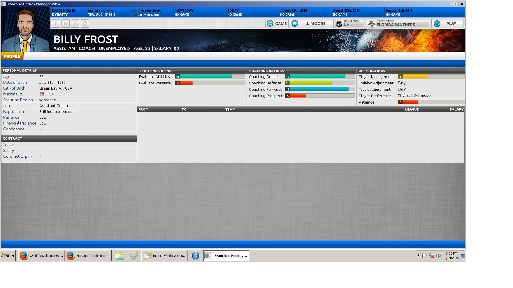 My decision on keeping Coach McCabe was his youth and likelihood of getting better at coaching and his good skills at player management which will counterbalance Coach Tyulin's shortcomings. As we all agreed, my fifth asst. coach will be Adam Pauwelyn for his evaluation of potential and prospect coaching. Both of the new coaches came cheaply but will have to work hard to keep their jobs and improve their skills, just like the players!