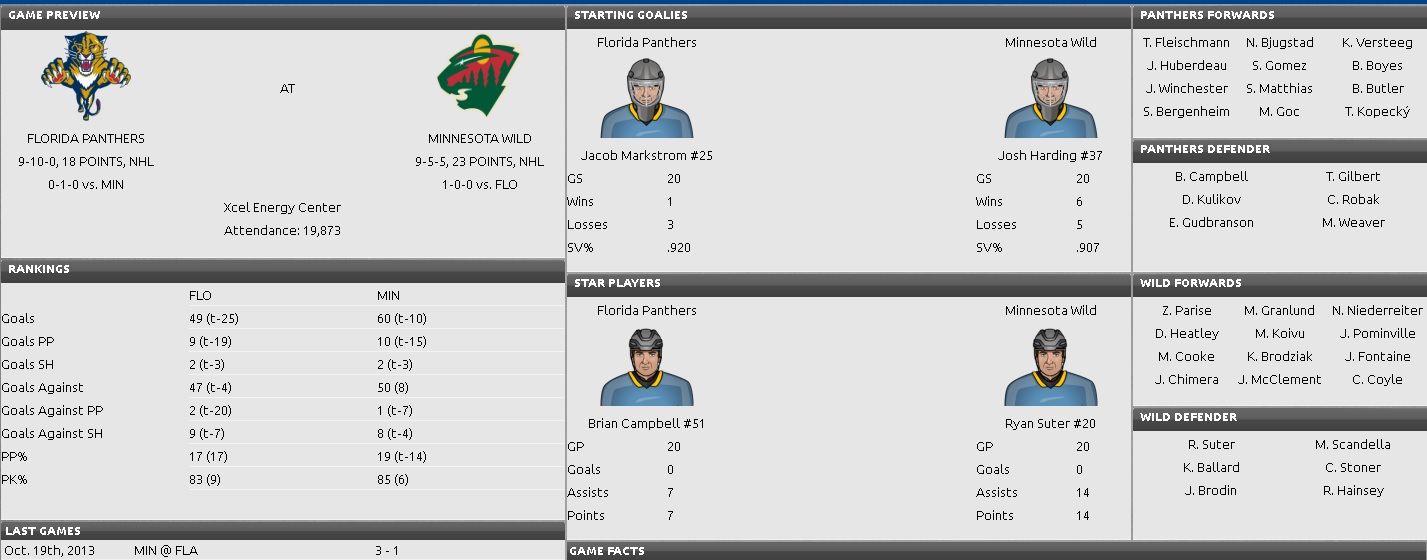 The first period shows the Panthers outshot by 13 - 7 margin but the hold the lead 1 - 0 as D Kulikov moved into the slot after dumping into the offensive zone. Two Panthers and three Av's battled for the puck when the puck came out from behind the net right to Kulikov, which left Av's G Varlamov helpless to stop the top shelf wrister. Despite the Av's hitting anything that moved there were no penalties called.