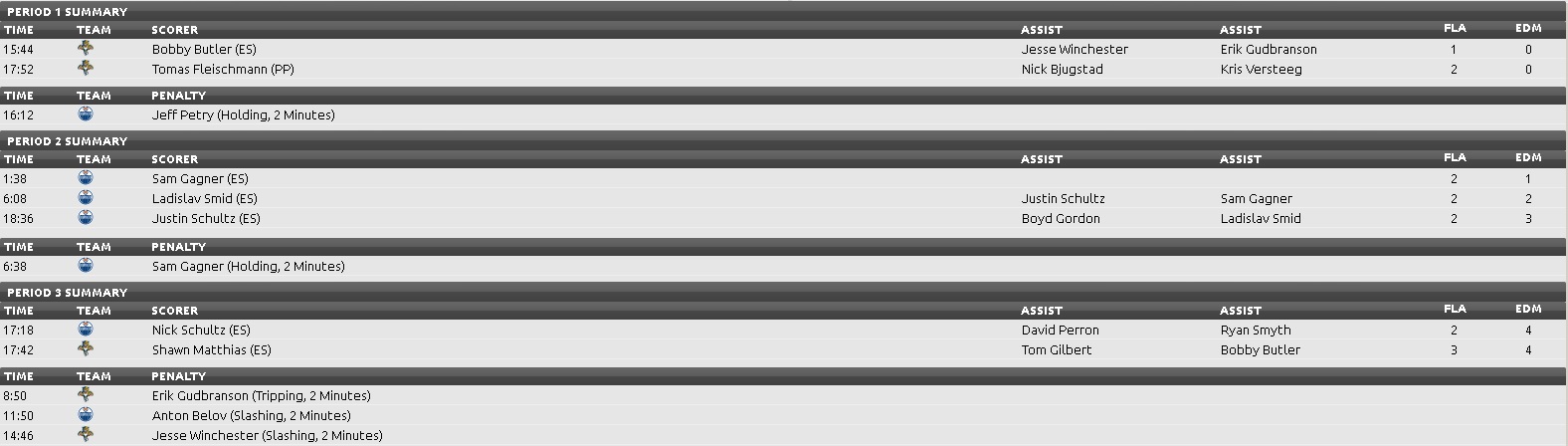 The first period is pretty even although the Oilers are much quicker overall with their skating. This is causing some pressure and a couple of turnovers, but the team responds in the last 5 minutes of the first by burying 2 goals including a PP goal by LW Fleischmann.