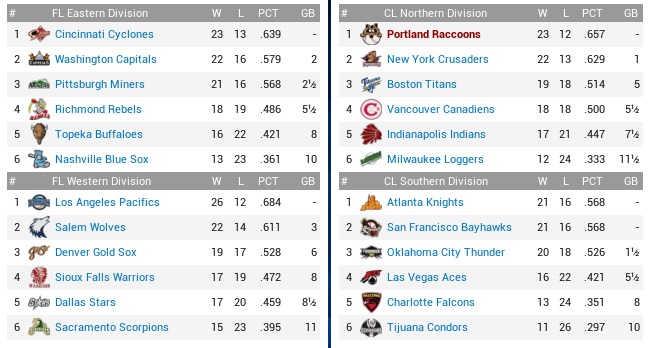 The Loggers were on a 3-game winning streak, so we’d better cover our heads. There was the thing with them still being 11th in both runs scored and runs allowed, but a streak is a streak. Yes, the Critters had their own 3-game winning streak. The Loggers were without SP Fabien Armand and veteran infielder Bartolo Hernandez, who were on the DL. Projected matchups: Javier Cruz (4-1, 2.80 ERA) vs. Ramón Huertas (0-1, 1.80 ERA) Nick Brown (2-2, 1.43 ERA) vs. A.J. Bartels (1-4, 5.77 ERA) Greg Grams (4-0, 4.11 ERA) vs. Fernando Cruz (2-2, 4.59 ERA) Colin Baldwin (2-3, 3.48 ERA) vs. William Lloyd (1-4, 4.98 ERA) We get two right-handers first, two left-handers later. Huertas had pitched in single-A ball at the age of 31 this year, so he was probably not going to hold his ERA from two major league games forever. Brown’s matchup looks like a 13-inning game that ends 2-1 for any team on a passed ball. The outlook on Luke Black was that he might be fine by the end of the week, and was not put on the DL and instead kept around for pinch-hitting, but he wouldn’t start any games, since he shouldn’t throw with that tender elbow. Game 1 POR: CF Castro – 2B Correa – RF Alston – 1B Quebell – LF Pruitt – C De La Parra – SS Roudabush – 3B M. Gutierrez – P J. Cruz MIL: LF J.R. Richardson – CF J. Garcia – 1B Hiwalani – C Baca – SS T. Johnson – 2B Tolwith – RF Delaney – 3B K. Scott – P Huertas Neither pitcher looked like much. Castro doubled and scored on Correa’s single in the first, but three hits scored two runs off Javier Cruz right away in the bottom of the inning. Castro got on with a single in the third, stole second, scored on another Correa single to tie the game, and then Alston lifted his ninth bomb of the season to put the Raccoons up 4-2, only for Cruz to give up another run in the bottom of the same inning, and the lead didn’t hold past the fifth inning, when Bakile Hiwalani showed he wasn’t quite dead yet and rapped his third hit of the day, a 2-run homer off a hapless Cruz. The Raccoons failed to knock Huertas from the game despite putting Nomura and Castro on base to start the seventh inning, but this time Correa hit into a double play and Alston rolled one to Tolwith, who had been drilled by Cruz to start the sixth inning, leading to Cruz’ banishment. The catching mook hit into an inning-ending double play in the eighth, still against Huertas. Black hit for Gutierrez in the ninth, reached on an error, and then Nomura hit … into one last double play. 5-4 Loggers. Castro 3-4; Correa 3-4, 2B, 2 RBI; Well, this was really a game we shouldn’t lose. But … hnggh. The Crusaders had Monday off, shrinking our lead to half a game. Game 2 POR: CF Castro – SS Correa – RF Alston – 1B Quebell – LF Pruitt – 2B Nomura – 3B Sharp – C Esquivel – P Brown MIL: LF J.R. Richardson – 1B J. Hernandez – RF Hiwalani – CF T. Austin – SS T. Johnson – C Olson – 3B S. Johnson – 2B Jennings – P Bartels Four singles and a walk led to three runs for the Raccoons in the top 1st, very uncharacteristic for a Nick Brown start. But you know what was the pure definition of a Nick Brown start? Rain. And it came in the second inning. After a 32-minute delay, the first pitcher Brownie faced, Mike Olson, homered to right, the Loggers’ first offensive achievement in the contest. The Coons knew how to slug, too, though, and chased Bartels in the top of the third, plating another four runs off him, including a 3-run homer by Sergio Esquivel, yet Brownie was messed up after the rain and was tagged with a 2-run homer by J.R. Richardson in the bottom of the same inning. So that’s a 7-3 game and still six innings left. The Coons added two runs off long man Gabriel Caro in the middle innings, but Brown didn’t get out of the sixth, in which Hiwalani and Tom Johnson hit doubles off him. He left with a 9-4 lead, with Ted Reese replacing him, who allowed Johnson to score by walking Spencer Johnson before Esquivel threw away a Dave Jennings grounder. For a while the goal was then to have Reese pitch the game to conclusion, but he sucked himself out of a long save in due time. In the bottom 8th, with two out, Olson singled and Johnson doubled, which was enough danger to the W that Law Rockburn came in to strike out Jennings, which he accomplished, and then pitched a fairly quick ninth, too. This time the Loggers ended the game with a double play hit into, Joaquín Hernandez being the culprit. 9-5 Brownies. Correa 2-5; Alston 3-4, BB; Quebell 2-4, BB, RBI; Pruitt 2-4, 2B, 2 RBI; Sharp 2-5, 2 RBI; Esquivel 2-5, 3 RBI; Rockburn 1.1 IP, 1 H, 0 R, 0 BB, 2 K, SV (1); When it really wasn’t pretty, it was good enough. Baseball was the strangest game, and so Nick Brown won his 100th career game in a shoddy outing that wasn’t quite a 13-inning, 2-1 affair. Him being 31 years and 162 days old, nobody should gamble on 200. But he struck out seven to run his career strikeout total to 1,656. He lost the CL ERA lead, though, with this shoddy outing, dropping behind SFB Tyler Sullivan (1.76 to Brown’s 1.93), who also leads the league in strikeouts. His five wins tie him for second behind OCT Daniel Dickerson’s seven victories. Game 3 POR: LF Castro – 2B Correa – RF Alston – 1B Pruitt – 3B Sharp – C Esquivel – SS Roudabush – CF Trevino – P Grams MIL: LF J.R. Richardson – CF J. Garcia – 1B Hiwalani – RF T. Austin – C Baca – SS T. Johnson – 2B Tolwith – 3B Jennings – P F. Cruz Sharp was front and center in the first inning, first leaving two men in scoring position in the Coons’ batting half, then putting Richardson on base with a horrendous throwing error, but luckily the Loggers left their men at third base as well. Richardson struck out to leave the bases loaded in the bottom 2nd, with three hard singles hit off Grams to get them stocked in the first place. Again, the Raccoons would score first. Pruitt reached in the fourth, stole s