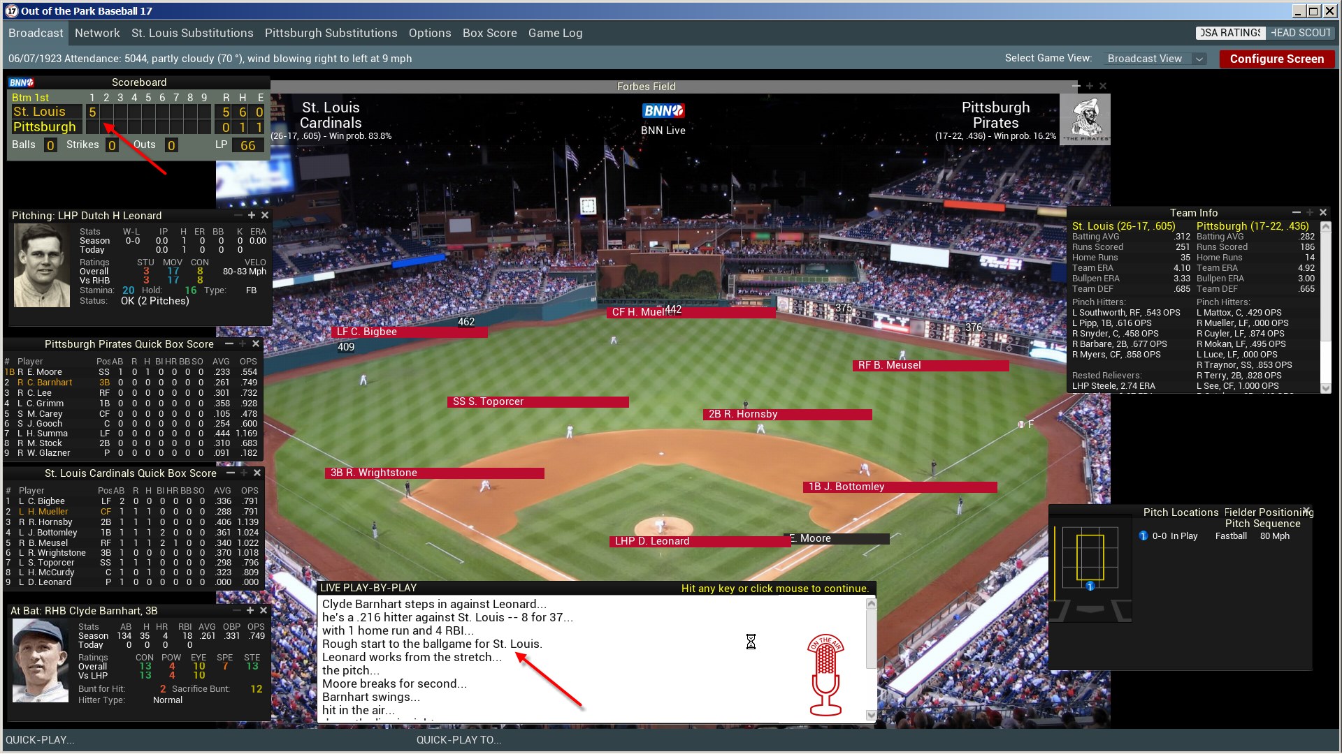 This is the game log. The problem from Post 20 above is the first play in the log: Fly Out, F7 (Flyball, 89S). For Post 22 it is the 4th play in the log: Triple (Flyball, 9D).