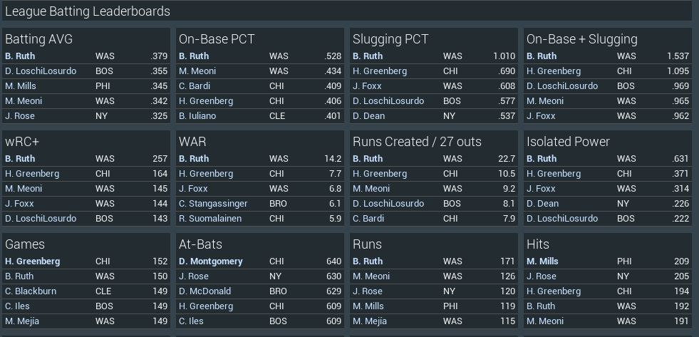 I use neutralized stats. MLB ERA in 1938 was 4.28. AL in the ABF was 4.58. Lefty Gomez went 31-10 2.68 359 IP i try to limit how many real players i import each year but their were many real MLB stars in the league at the time. Fictional players tend to be worse then MLB for offense but better for pitching.
