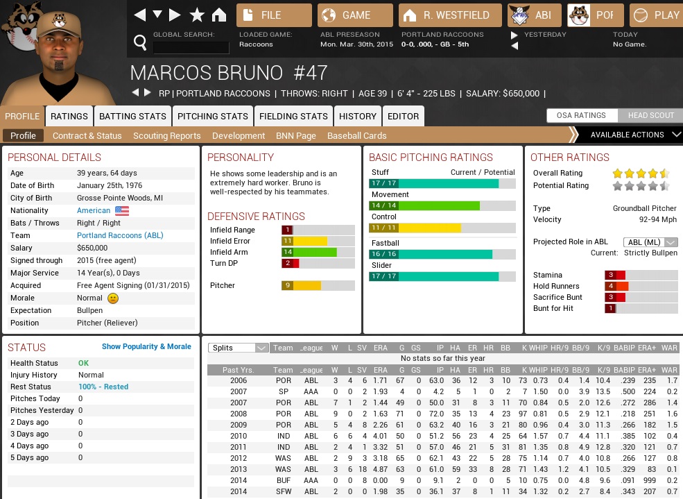 Well, there was one exception. The trade of Ron Sakellaris meant that there was an opening in the pen for a 7th/8th inning role for a right-handed pitcher. More of the seventh inning, really, since Zack Entwistle was about all I wanted from a setup reliever. So all those years we had no money, and now we have money and couldn’t find anybody. It’s a strange situation. We have a lot of players who make the minimum and occupy significant roles, f.e. two guys in the starting lineup, and, oh, the reigning ERA champ. So much money will go into the player development, although there isn’t much worth noting to develop. The last two years we have traded a lot of semi-meaningful prospects, and the drafts have been poor for a long time. On the other hand, we can go nuts in the international free agent signing period in July again. We blew $500k on SP Danny “Nails” Arguello in 2013, which meant that we couldn’t do much in 2014, and Arguello will start the season in Aumsville as an 18-year old. I don’t even quite know what I am complaining about. Looks like it will be a strange season. On the other side of it, we will have nine free agents: Dickerson, Murphy, Bednarski, Conway, Reya, Richards, Bruno, Casas, Entwistle are up for free agency. They make a total of about $11.4M this year. The only proper contracts remaining for 2016 and beyond are with Brownie, D-Alex, Santos, Sandy, and Thrasher. The team might look very different next season. +++ January 8 – One day after his 41st birthday, ex-WAS SP Randy Farley (211-176, 4.03 ERA) signs a 2-yr, $3.88M contract with the Bayhawks. January 8 – Meanwhile, the Bayhawks’ former SP Reynaldo Rendon (72-66, 3.77 ERA) signs with the Stars. The 30-year old right-hander gets $14.28 over five years. January 9 – Ex-MIL CL Jose Ramos (39-29, 3.91 ERA, 62 SV) inks a 3-yr, $4.2M contract with the Scorpions. January 23 – Ex-POR/DEN OF/3B Joe Cowan (.245, 53 HR, 389 RBI) and the Miners come to terms at 2-yr, $1.7M for the 32-year old left-handed batter. January 31 – The Raccoons re-sign 39-yr old former Warrior MR Marcos Bruno (57-54, 2.95 ERA, 94 SV) on a 1-yr, $650k contract. January 31 – The Titans sign former Cyclone RF Jose Silva (.294, 89 HR, 587 RBI) to a 5-yr, $7.3M contract. Rumor has it that the 32-year old Silva is already ailing so hard that he can only get through the season on persistent painkiller prescriptions. February 3 – The Crusaders continue to throw money at every player they care to get, signing 31-yr old ex-SFW SP Fernando Cruz (88-108, 4.06 ERA). The left-hander receives $23.33M over seven years. February 3 – Veteran 1B/2B Oliver Torres (.307, 38 HR, 721 RBI) inks a 2-yr, $2.48M deal with the Cyclones. Torres, 37, was with the Thunder the last few years. February 7 – 30-yr old ex-DEN/POR SS/1B Rob Howell (.274, 15 HR, 275 RBI) inks a 1-yr, $486k contract with the Warriors. February 27 – The Bayhawks sign ex-NYC CL Micah Steele (40-40, 2.76 ERA, 193 SV) to a 1-yr, $740k contract. +++ Bruno will be 39 at the end of January. It looks questionable from the outside, I agree. But he was not only the best option available, he is also a perfect option for the Raccoons. Bruno pitched for the Raccoons from 2001 through 2009, with the 2005-2009 years seeing him utmost dominate batters, with a worst ERA of 2.36 in that period. He struck out 10+ per nine every year, up to 12.6, walked few and was hardly ever taken deep. As soon as he left Coon City in 2010, things went south. He had a 4.01 ERA in ’10 with Indy, then two 3-something campaigns in Indy and Washington, before running up a 4.87 ERA with the ’13 Capitals. He missed some time last year, but produced a 1.98 ERA with the Warriors while dropping under 10 K/9 for the first time since 2003. His velocity is markedly down from his hey-days, when he could touch 100 mph. He throws more around 93 now. But the slider is still as venomous as ever and he has sink that generates grounders galore. The reason he struggled in Indy and Washington were high BABIP’s, with a .320+ BABIP in all but one of the four years. The worst BABIP he had in Portland was .310 in his rookie season, when he ran a 4.46 ERA (also walking 6.6 per nine), and the 2010-11 Indians and 2012-13 Capitals were among the worst defensive teams in their leagues in the seasons in question. And the Raccoons just hauled in a shortstop that will happily gobble up Marcos’ grounders. There was some quabble over the uniform number to be assigned to Bruno. He wanted #37 back, which had since been used by Bill Conway, and not only did I have to contend with these two in my office, but also Maud, who took Bruno’s side for financial reasons (the eleven Conway fans would certainly buy a new shirt with the new number!), and Slappy who was highly averse to any kind of labor and refused to iron another number onto Conway’s uniforms. Chad sat on the couch with the mascot head and nodded constantly, agreeing with everybody. In the end, Conway kept the number, because I can’t afford to alienate Slappy, who knows all the liquor stashes around the premises. Marcos Bruno is SO OLD, he’s one of the view remaining players whose birth predates the ABL. +++ Jon Merritt’s career is in fact NOT over! He signed a $306k contract with the Rebels in early March. Should have offered him arbitration, I guess. But the chances were for him to take us to arbitration, and we just have no room for him on the roster. What else? Ex-Coons that signed minor contracts included Freddy Rosa ($266k with the Knights), Michael Palmer ($234k with the Stars), Raul Hernandez ($226k with the Elks), Kenichi Watanabe ($438k with the Warriors), Logan Taylor ($250k also with the Warriors), Mark Thomas ($258k with the Cyclones)