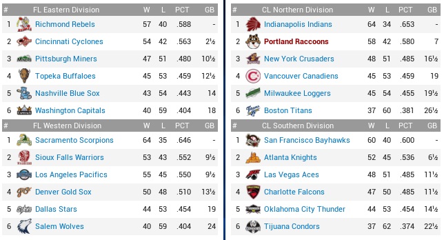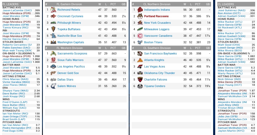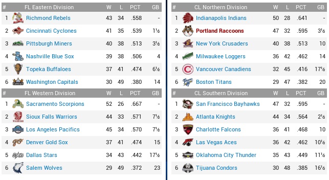 I am entirely not sure how the Indians do it. Their lineup lacks any big names. They are consistently hitting for high average to overwhelm opponents over time, but now that they have lost Jong-beom Kym they have no way to replace him, unless Steve Madison suddenly grows another 100 points of batting average. Their league-best rotation entered this season a combined 26 games under .500, yet "Ant" Mendez suddenly leads the ABL in ERA. Dan Lambert has been the only other starter that was even decent in recent years. There's some wicked stuff going on with them, and I expect them that they will not keep playing over .600 for the second half of the year, just like I expect the Raccoons to at some point stop plating ten runs per game.
