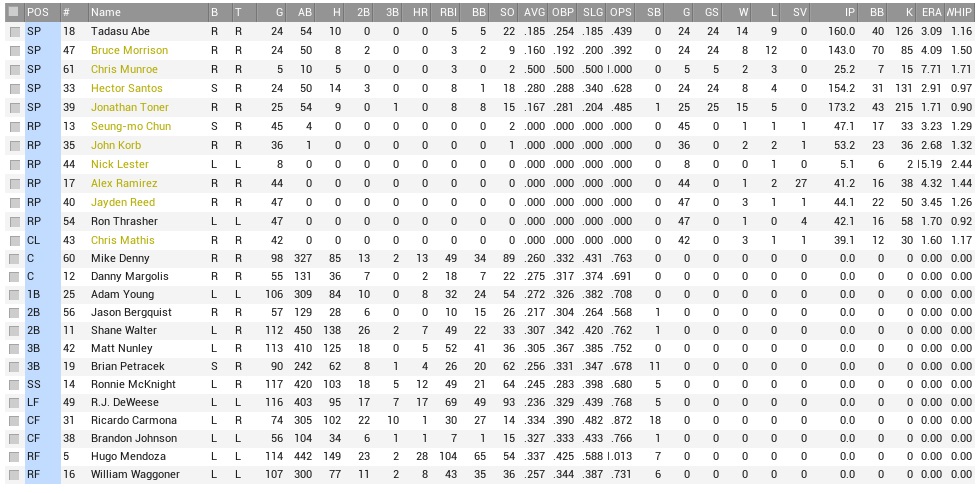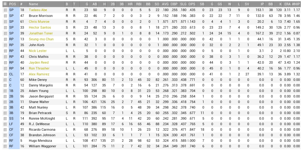 The Thunder were 10th in offense and 7th in runs allowed, but they had been quite miserable all year, and that hadn’t changed yet. They also had lost their last five games, and they had six players on the DL, including a complete outfield and a few pitchers that might be able to help them. The Coons had won two of three in the first meeting of the teams in May. Projected matchups: Hector Santos (5-4, 2.99 ERA) vs. Brian Furst (8-10, 4.50 ERA) Jonathan Toner (13-4, 1.77 ERA) vs. Brian Benjamin (5-12, 6.46 ERA) Bruce Morrison (7-9, 3.77 ERA) vs. Fernando Estrada (1-2, 4.58 ERA) We had faced all Brians/Bryans the first time we saw the Thunder this year, and technically they would be in order again, except that Bryan Robbins (5-7, 4.37 ERA), their lone southpaw, had left his last start with an injury and was undiagnosed as the series started. The Thursday starter was a bit open for them right now. Speaking of Thursday, we had Monday off, but would now begin a string of 16 straight games. Cookie was still slimy on Tuesday and was not in the starting lineup for the opener. That was one nasty cold! He was available for pinch-hitting, however. Game 1 OCT: CF Gosnell – 2B Farias – LF Alston – 1B Manfull – C Parks – RF Cisneros – 3B Ruggeri – SS Janes – P Furst POR: RF Mendoza – CF Petracek – 2B Walter – LF DeWeese – 3B Nunley – C Denny – SS McKnight – 1B Young – P Santos After a leadoff single by the clawless Tiger, Petracek whiffed and Walter grounded to second base. Emilio Farias initially tried to turn two, couldn’t get the ball out of the glove, then tried to get Walter at first, but spiked it and fooled B.J. Manfull. The ball escaped for a 2-base throwing error, and when DeWeese lifted a ball to right, Mendoza went and was thrown out by Javy Cisneros, ending the inning. The next frame, Nunley and Denny both had singles to get going. McKnight grounded out to first, but Young and Santos both hit soft lines that dropped into no man’s land in the shallow outfield for a pair of RBI singles. The Thunder didn’t score in the early innings, but hit a few balls hard off Santos. By the fourth, they were hitting softer balls and those actually fell in. Ron Alston would have a leadoff single, and B.J. Manfull reached on an infield single. After Jalen Parks popped out, Santos hit Cisneros and the bases were loaded. D.J. Ruggeri lifted a ball to center, Petracek had it comfortably, and Alston made for home – and now the Thunder had their guy thrown out at home plate, and this one ended the inning, too. Santos was certainly glad, but was in more trouble in the fifth, putting runners on the corners with one out. Farias actually managed a sac fly to cut the lead in half, but Alston struck out in a full count. Santos hit a leadoff double in the bottom 5th, never was moved off second base by the collective scum in the lineup, and that allowed the Thunder to take a 3-2 lead in the top 6th when Santos walked Parks and allowed a bomb to right center to Cisneros. Leaving runners in scoring position continued in the sixth when McKnight hit a 2-out triple into the rightfield corner, Young was put on intentionally, and Cookie hit for Santos, but grounded out to short. The Thunder loaded them up against Reed and Beaver in the top 7th, but Parks struck out to leave them on, and in the bottom 7th, the Raccoons had runners on the corners after Mendoza drew a leadoff walk and then went aggro to third on Walter’s 1-out single. The Coons barely managed the tying run with a sac fly by DeWeese, and left two more on base in the bottom 8th of a then 3-3 game. Alex Ramirez, who had been utter **** for many weeks now, managed to kill the game in the top 9th with a leadoff walk to PH Sergio Benito and a subsequent single by Chris Gosnell. Ron Alston would hit a 2-run double to give Oklahoma a win, although that didn’t happen without some late drama. After poor outs made by Brandon Johnson and Walter, DeWeese hit a bomb to get the Raccoons back to one run. Then Nunley singled, Denny singled, and McKnight flew out to left. 5-4 Thunder. Nunley 2-5; Denny 2-5; Young 2-3, BB, RBI; Margolis (PH) 1-1; I could elaborate how much dead money we have in this non-closer of ours, but it’s not remotely as much dead money as is stuck in the pathetic lineup, so I won’t bother. Actually, I will. Ramirez is due another $2,970,679. Well, done, champ, well done. The Thunder announced that Bryan Robbins was headed for the butcher with bone chips in his elbow on Wednesday, so that ended the left-hander’s season. They moved Estrada, who came out of the pen and was not yet on a rhythm, into the middle game with the announcement. Game 2 OCT: CF Gosnell – 2B Farias – LF Alston – 1B Manfull – C Parks – RF Cisneros – 3B Ruggeri – SS Janes – P F. Estrada POR: CF Carmona – 2B Walter – RF Mendoza – LF DeWeese – 3B Nunley – C Denny – SS McKnight – 1B Young – P Toner Walter’s sac fly turned Cookie’s triple into a run in the first, but Toner soon found himself mired in quicksand. Parks hit a 1-out triple in the second, a liner into the rightfield corner that decided to build a nest and breed young out there, leading to Mendoza to take forever to get a throw in. Toner then hit Cisneros and walked Ruggeri, before bailing out with strikeouts to Erik Janes and Estrada – a long nightmare of an inning that romped his pitch count close to 40 already. Toner wouldn’t allow another runner until Estrada hit a 2-out single in the fifth, then walked Gosnell right away, and also walked Manfull in the sixth, but that was about all he gave to the Thunder while whiffing ten. Unfortunately, that also took him to 100 pitches through six, and the team was absolutely no help in making it a safer W for him. Toner’s spot was up to lead off the bottom 6th, and the Coons had three meager hits. Johnson hit for him, failed, but Cookie singled to left. DeWeese would eventually get him singled in with