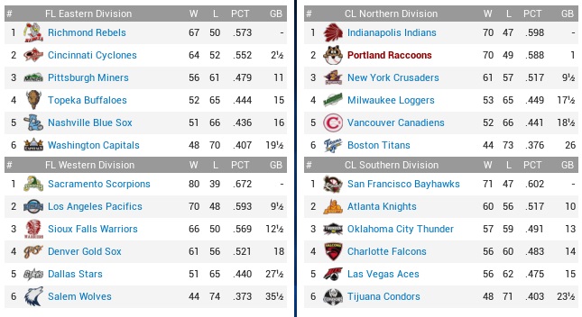 25 1/2 games out, the Titans were miserable. The worst product in the league when it came to keeping the opposing team off the scoreboard, they had conceded 503 runs, more than 5.5 per game. Their offense was eighth, and their run differential had plunged into negative triple digits at -106. Right now, they also had a few outfielders including Jonathan Blake on the DL to make their lineup even worse than it was. The Coons so far had taken a 6-3 lead in the season series. Projected matchups: Tadasu Abe (10-8, 3.16 ERA) vs. Chris Klein (5-11, 6.04 ERA) Hector Santos (5-4, 3.04 ERA) vs. Jose Fuentes (3-8, 5.07 ERA) Jonathan Toner (12-4, 1.86 ERA) vs. Alfredo Collazo (0-2, 8.59 ERA) We skipped Damani Knight, because the week started with an off day, and I can’t bear him. They are sending three right-handers, and let’s see how this affair of Johnny facing another pitcher with four times his ERA will go… Game 1 POR: CF Carmona – 2B Walter – 1B Mendoza – LF DeWeese – 3B Nunley – C Denny – SS McKnight – RF Johnson – P Abe BOS: CF Mata – 2B M. Rivera – 1B S. Butler – C T. Robinson – RF Branch – 3B T. Thomas – LF X. Williams – SS Vasquez – P Klein A small and disillusioned crowd got kicked in the groin early as Klein, who had significantly more walks than strikeouts, got Cookie to fly out to Xavier Williams to start the game, but was then burned for a 4-spot. After Walter and Tiger singled, DeWeese hit an RBI double and Nunley hit a 3-piece to right center to give Abe an early cushion. Klein’s nightmarish control was also on display early. He issued five walks by the third inning, which included three walks to load the bases in that third inning, which brought up Brandon Johnson with one out. Johnson popped out and Abe lined out softly to Mike Rivera to end the effort. While Abe retired the first 11 Titans before Steve Butler doubled (but was left on), Klein walked six in his start and despite the early shelling reached the sixth inning, where he was finally knocked out after a 2-out single by Tiger and a subsequent double by DeWeese, which added a run for a 5-0 score. Former Critter Kenichi Watanabe replaced Klein, and he did not have a better ERA… He would pitch into and out of trouble in the seventh and eighth, the Coons stranding pairs in both innings, but at least Abe was still running a 2-hitter … until he didn’t. Tom Thomas opened the bottom 8th with a double and suddenly Xavier Williams unloaded a homer to right center that brought the Titans back to 5-2. Abe got one more out before being replaced by Thrasher, who ended the inning. Given the flock of left-handed bats that the Titans had in their lineup and Alex Ramirez’ infinite struggles, Thrasher was left in for the ninth, but allowed two hits before he got two outs, then threw a wild pitch. Ezra Branch grounded out to short, which allowed Rivera to score, but Tom Thomas struck out to end the game without Ramirez having to come into a hot mess. 5-3 Coons. Walter 3-5, 2B; Mendoza 2-5; DeWeese 2-3, 2 BB, 2 2B, 2 RBI; Nunley 2-5, HR, 3 RBI; Abe 7.1 IP, 4 H, 2 R, 2 ER, 1 BB, 4 K, W (11-8); For the middle game, the Titans decided to give Eric Rasmussen another shot at starting, having last pitched before the All Star break. He was 1-6 with a 4.84 ERA, so no significant improvement over the other guys. Game 2 POR: CF Carmona – 2B Walter – 1B Mendoza – LF DeWeese – 3B Nunley – C Denny – SS McKnight – RF Waggoner – P Santos BOS: CF Mata – 2B M. Rivera – 1B S. Butler – C T. Robinson – RF Branch – 3B T. Thomas – LF X. Williams – SS Vasquez – P Rasmussen The Raccoons left Mike Denny on third base after a second-inning triple(!), then had Walter and Nunley kill the next two innings with double plays while the Titans took an early 1-0 lead on a Thomas double and Williams single. Santos inexplicably added two walks to a 1-out Alex Mata single in the bottom 3rd, but got out when he played Ezra Branch’s grounder himself for the third out. He also walked Williams in the fourth, but Denny picked him off. A decently sized rain delay got Santos out of the game after five innings, but maybe the Coons could at least spare him the loss; Cookie at least led off the top 6th with a double to right and moved to third on Walter’s groundout. Tiger hit a ball JUST past Rivera for a game-tying single, then was caught stealing (like Waggoner had been caught the previous inning). Chun put runners on the corners in the bottom 6th before Beaver had to come out with Williams being the first of the long string of left-handed batters that ran from the bottom to the top of the order. Williams hit a drive to deep center anyway, but Cookie threw himself in harm’s way to get that defused and keep the game tied. It didn’t remain tied for long. Jasper Holt pinch-hit for Robbie Vasquez to start the bottom 7th. He was a right-hander, we weren’t falling for that, and Holt doubled. It could hardly get worse, except that Mathis appeared with one out and allowed three singles and a wild pitch before the inning ended on a grounder that happened to find Walter, but by then two runs were across. The Coons would load the bases in the top of the eighth against southpaw Matt Branch, who walked two and brushed the Tiger, which unfortunately meant that DeWeese batted with two outs. He hit a ball, but he hit it softly and right to Steve Butler to end the inning. Nobody reached against Harry Merwin (even their closer had almost as many walks as strikeouts!) in the ninth. 3-1 Titans. But to be fair, Raccoons pitching in this game also walked more (5) than they struck out (4)… Game 3 POR: CF Carmona – 2B Walter – RF Mendoza – LF DeWeese – 3B Nunley – SS McKnight – 1B Young – C Margolis – P Toner BOS: CF Mata – 2B M. Rivera – 1B S. Butler – C T. Robinson – RF Branch – 3B T. Thomas – LF X. Williams – SS Vasquez – P J. Fuentes Fuentes was the third Titans starter in the series to