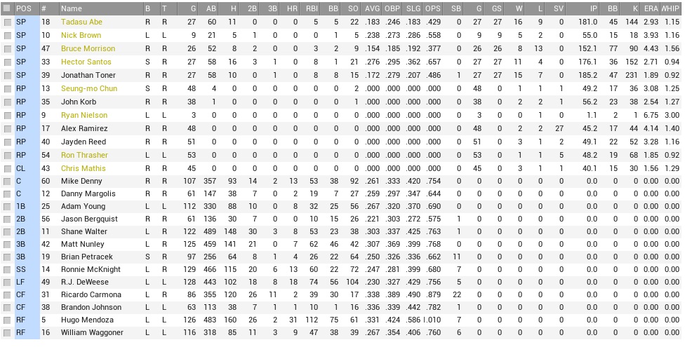 Raccoons (40-27) @ Indians (44-22) – June 16-18, 2017 The Indians were quite good, and that was an understatement. Although I was yet not certain how they had gotten to second place in runs scored and being tied for first in runs allowed (with the Critters), the resulting +99 run differential certainly made them appear legit in the middle of June. Their rotation was the best in the league, while their pen was second-best, and they also led the league in batting average. Despite this, so far the Raccoons had the leg up in the season series, having taken three of four games in the first meeting between the teams. Projected matchups: Tadasu Abe (6-6, 2.94 ERA) vs. Alejandro Mendez (10-3, 1.81 ERA) Bruce Morrison (5-6, 3.64 ERA) vs. Dan Lambert (8-5, 2.79 ERA) Jonathan Toner (9-2, 1.46 ERA) vs. Josh Riley (7-4, 3.76 ERA) This is three right-handers, although they had an off day and could skip Riley in favor of the southpaw Tristan Broun (10-2, 3.16 ERA) on Sunday. Since Nick Brown had yet to make his rehab start in St. Petersburg and wouldn’t be ready for a turnaround on Monday, we’d see another glimpse of Damani Knight then. Ronnie McKnight enters with a 10-game hitting streak. Game 1 POR: CF Carmona – 2B Walter – 3B Nunley – LF DeWeese – SS McKnight – C Margolis – RF Ochoa – 1B A. Young – P Abe IND: CF J. Wilson – SS Matias – LF Genge – 2B Kym – RF Gilmor – C Padilla – 3B Mathews – 1B S. Madison – P A. Mendez Despite only an infield single allowed to Shane Walter in the first three batters, “Ant” Mendez caught some unexpected flak in the first inning, allowing three straight 2-out singles to the 4-5-6 batters, amounting to two runs for the Critters. A good start to the series for sure, but unfortunately Abe created a lot of nervousness around our dugout thanks to allowing a lot of base runners. The Indians appeared to have him in the bottom 3rd when Mendez lined sharply past Young and was followed by John Wilson, putting the tying runs on with one out, but Abe got out by retiring Raul Matias and Lowell Genge. In the bottom of the fourth, Jong-beom Kym and Nick Gilmor led off with singles, and Steve Madison loaded the bases with another single to right with two outs, but that brought up Mendez again, and this time he struck out. After the early pair of runs, the Raccoons had fallen a bit silent, landing only one base hit in the next three innings, but to start the fifth they suddenly hit liners all over the place. Cookie opened with a double to deep left and scored on line drive singles by Walter and Nunley, 3-0. DeWeese loaded them up with a grounder into centerfield, and no outs! The Indians only got the out at second base when McKnight grounded to Matias, allowing another run to score, but Mendez then escaped whiffing Margolis and getting some support from Genge in retiring Ochoa, who sent a fly to fairly, but not dangerously deep left. Leadoff singles for the Indians in the bottom 6th and 7th were both times erased with double plays, and Abe ended up arriving in the ninth inning unscathed and having thrown exactly 100 pitches through eight. Kym led off the inning, had two leadoff singles in the game, and landed his third one, a soft loop into right center for another single. While Gilmor got him forced with a grounder, Dave Padilla singled quite determinedly to left, and that was the end for Abe, with the tying run appearing in the on-deck circle. Alex Ramirez was called on, and casually filled the bases with another single hit by Joey Mathews. Bartolo Román hit for Madison, but struck out, and then unheralded Josh Malone hit in the pitcher’s spot. His first-pitch grounder went right to Young for the final out. 4-0 Raccoons. Walter 2-5; DeWeese 2-5, RBI; Abe 8.1 IP, 9 H, 0 R, 0 ER, 1 BB, 9 K, W (7-6) and 1-4; McKnight has an 11-game hitting streak, the Coons have a 7-game winning streak, and we also should mention the 13-game hitting streak for Jong-beom Kym, although we were actively trying to end it. Game 2 POR: CF Carmona – 2B Petracek – 3B Nunley – LF DeWeese – C Denny – SS McKnight – RF Waggoner – 1B A. Young – P B. Morrison IND: CF J. Wilson – SS Matias – LF Genge – 2B Kym – RF Gilmor – C Padilla – 3B Mathews – 1B S. Madison – P Lambert Again the Critters scored early; Cookie opened the game with a bloop double to right, and after an infield single for Petracek they were on the corners. Nunley plated Cookie with a sac fly, although it would take three more batters to get McKnight home, who hit a 2-out RBI single to score Petracek for an early 2-0 edge, although that 2-0 edge soon enough didn’t look like it could save Morrison from his follies. The Indians had the bases loaded as early as the second inning, though a Petracek error was instrumental in one of the runners reaching. With the bags full and one out, Madison struck out in a full count before Lambert bounced out to his opposite, Morrison. The Arrowheads weren’t denied much longer, though. John Wilson hit a leadoff double to left in the bottom 3rd, and with Morrison’s general lack of stuff it was not possible to keep him on. Genge plated him with a groundout, 2-1. The Raccoons would have the bases loaded with nobody out in the fourth after leadoff singles by Denny and McKnight, and Waggoner drawing a walk. Young, the sucker, struck out, and Morrison hit into a double play to score nobody. It was little consolation that Steve Madison also hit into an inning-ending double play (with two runners on base) in the bottom 4th, and that the home team left the bases loaded again in the bottom 5th. They had loaded the bases in the first place with zero hits, Morrison walking Wilson and Kym and plunking Matias in between. Gilmor flew out to DeWeese to end the inning. After a clean sixth we felt like we had tempted fate enough. Ochoa hit for Morrison in the top 7th, grounded out, and while Cookie hit a 2-out double afterwards, Lambert whiffed Petracek to
