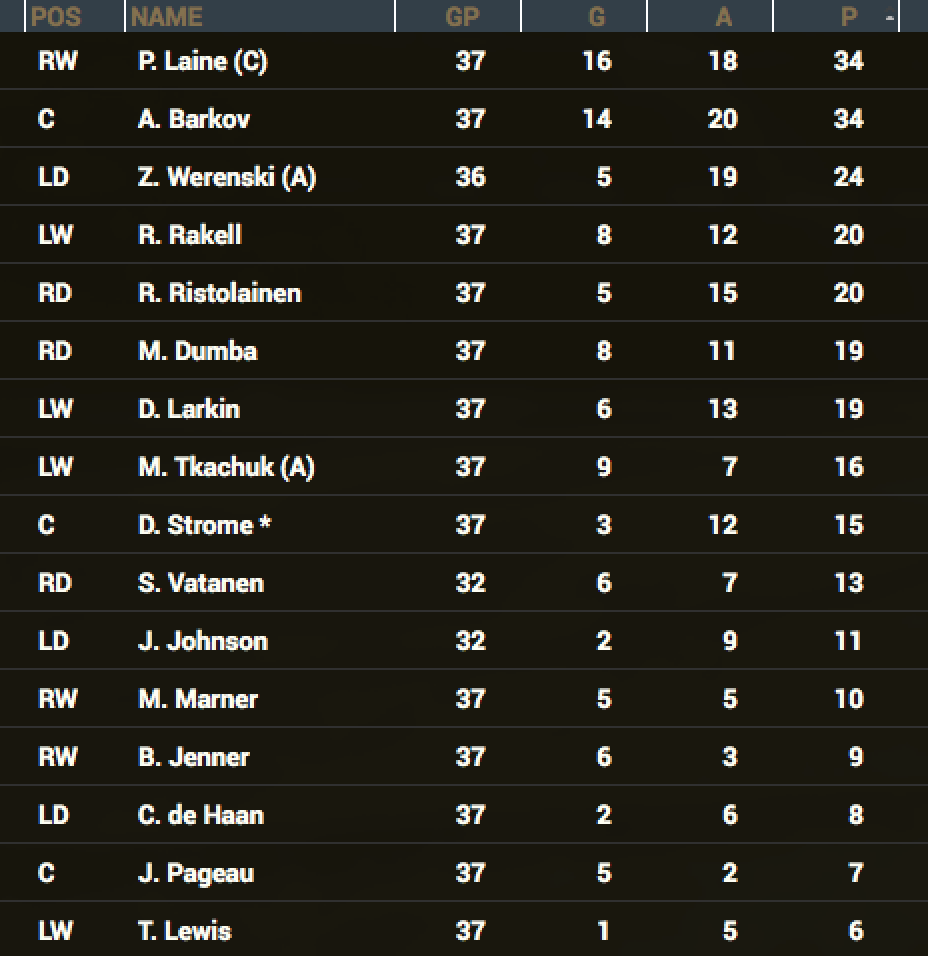 Matt Murray was selected to the all star team, and kept a clean sheet in it.. Matthew Tkachuk was selected as the player of the month for january... our 2nd line made great progress after a slight change in the Offensive Settings for Tkachuk and Marner.... the Owner of the VGK is now unhappy with the progress... only 9 points separate the 10th VGK from the 1st placed LA Kings... |
