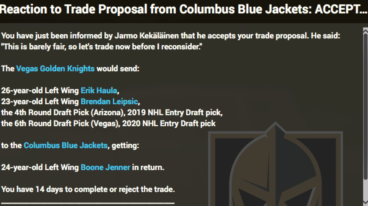 100% agree with you, I asked the Dev's quite a few times about the trading logic, and in fairness they do have to set some rules for trades to happen... The one that bugs me the most is the ability to trade for or away players with NMC or NTC, or when i get a player injured for months i can trade him for a player on the same level... I'm sure you heard of this guy called Gretzky... he got traded ;-) |