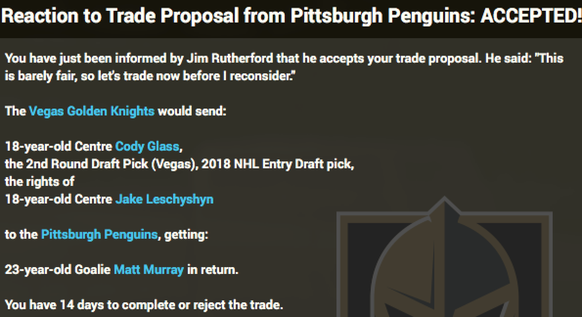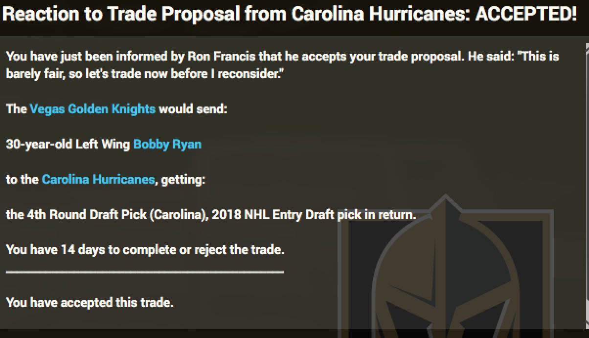 The Owner is satisfied with the progress made. The trade deadline has passed without the VGK doing anything, the most notable trade seen Calgary deal D Giordano to Montreal for C Drouin |