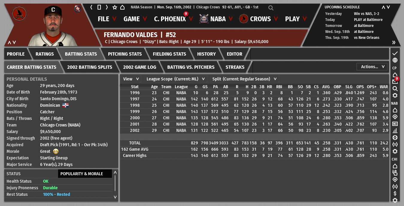 The kicker is he is asking for a 10 year extension. $11.2 million per season for a total value of 10 years/$112 million. Not terrible considering his numbers and he isn't the worst on defense although I wish he had a better arm. He is popular locally and well known nationally so I'm afraid resigning him will tank my fan interest and loyalty. Here are some screenshots of some info on the guy. In a post below this I will be posting my catcher waiting in the wings to take this guy's place. This is what is making this a difficult decision for me. I'm curious to know what you all would do in this situation. EDIT: I use 20/80 Ratings scale by the way. Last edited by The_Offspring187; 10-10-2018 at 01:11 PM. |