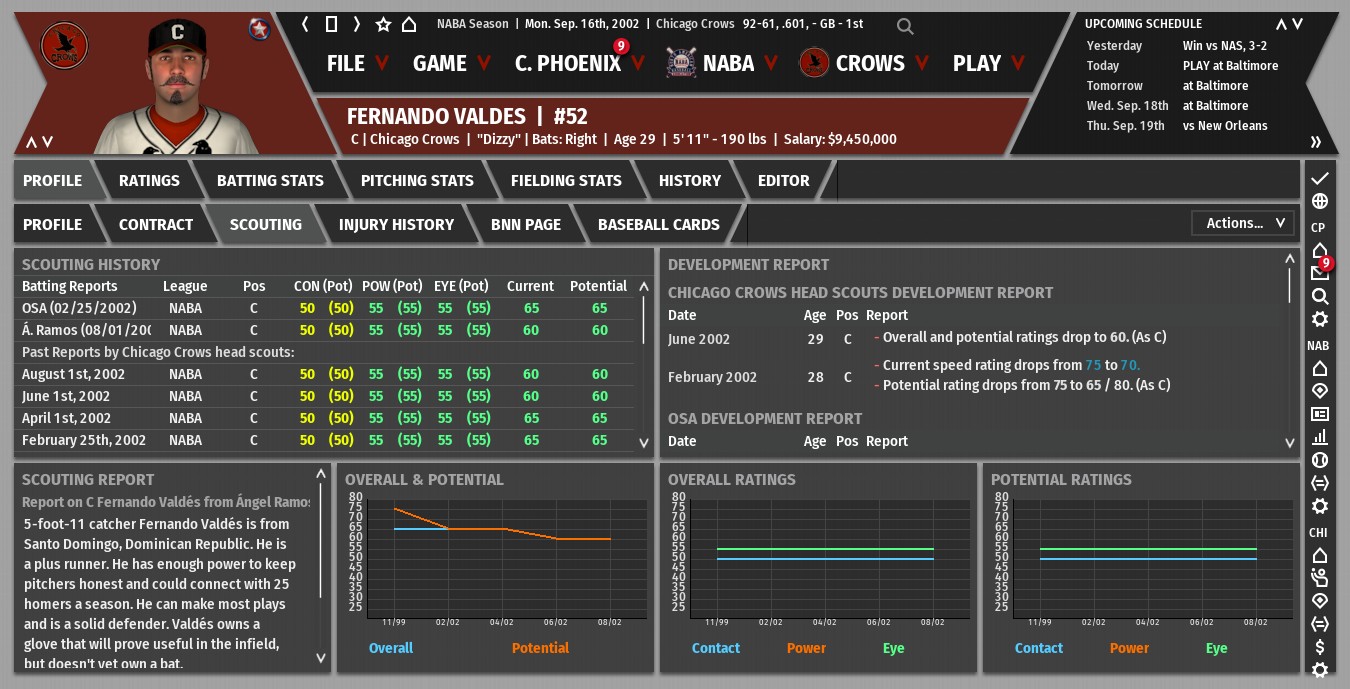 The kicker is he is asking for a 10 year extension. $11.2 million per season for a total value of 10 years/$112 million. Not terrible considering his numbers and he isn't the worst on defense although I wish he had a better arm. He is popular locally and well known nationally so I'm afraid resigning him will tank my fan interest and loyalty. Here are some screenshots of some info on the guy. In a post below this I will be posting my catcher waiting in the wings to take this guy's place. This is what is making this a difficult decision for me. I'm curious to know what you all would do in this situation. EDIT: I use 20/80 Ratings scale by the way. Last edited by The_Offspring187; 10-10-2018 at 01:11 PM. |