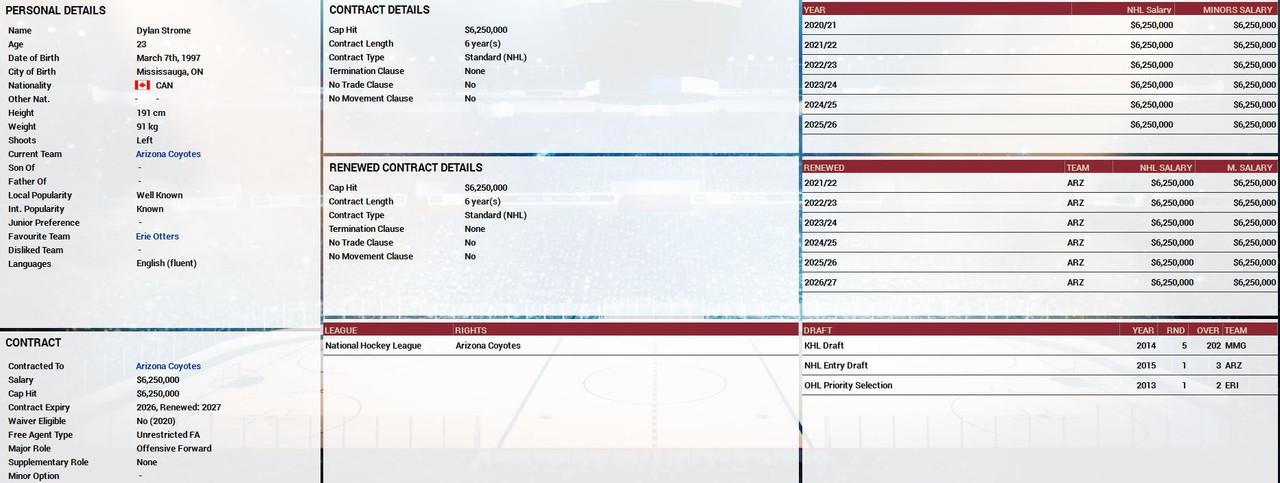 Thanks a bunch for looking into this! If possible we would like this fixed because the players on 1-year extensions from last season that are bugged cannot be offered extensions during the current season (Joel Kellman is one example). If we could clear out all extensions that show as signed so far in 2020/21 that would be great. We have simmed ahead from the file you received, I will PM you our current file later today after we have run today's sim. re: Jost, I believe what happened there is that I added the contract extension from my end at the very end of a sim, and it was signed during the first day of the following sim. That would be the only thing I can recall about that extension specifically. We did have the issue with multiple extensions showing up in the transaction log and player history during 2018/19 as well (see for example Ivan Provorov), but the contracts never appeared as duplicates during the 2019/20 season. Thanks again for your support! |