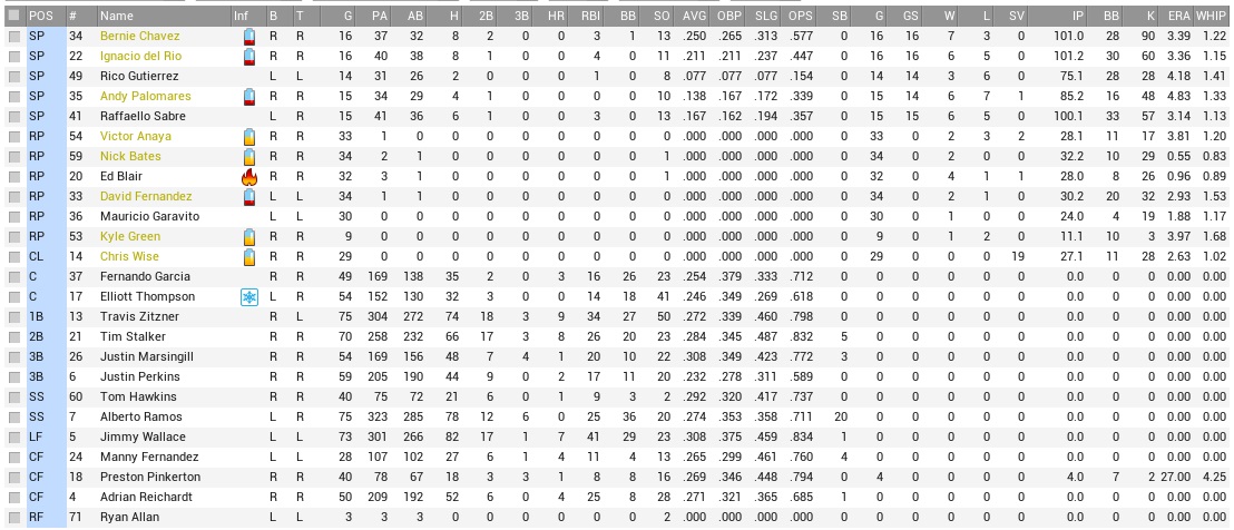 How about some Manny Fernandez? Our 2031 #5 pick was still not hitting a whole lot, but he also only got credit for a .258 BABIP that played a role in his .231/.292/.340 slash line. Raccoons (25-20) @ Aces (18-26) – May 24-26, 2033 The Aces pitching staff was *alright*… they were not wowing you in any way, but they were holding their end of the scale. The offense wasn’t. Not by a long shot. They had the fewest runs scored in the Continental League, putting up less than 3.4 runs per game. The Raccoons had lost the season series in 2032, 4-5. Projected matchups: Ignacio del Rio (2-4, 3.95 ERA) vs. Chris Guyett (4-5, 3.90 ERA) Raffaello Sabre (3-3, 3.20 ERA) vs. Natanael Abrao (0-4, 5.20 ERA) Andy Palomares (4-3, 5.28 ERA) vs. Howard Haws (3-4, 2.69 ERA) Another set with only right-handed opponents! Game 1 POR: SS Ramos – 2B Stalker – LF Wallace – 1B Zitzner – RF Hooge – CF M. Fernandez – C Garcia – 3B Perkins – P del Rio LVA: CF Stedham – SS G. Reece – RF Montes – 3B Armfield – 1B LeClerc – C Scheffer – LF J. Nelson – 2B Briones – P Guyett The first 11 batters in the game were all retired, including debutee Manny Fernandez grounding out to Mario Briones, before Philip Scheffer hit a double to right, and .194 slugger Justin Nelson fired a ball over the fence in left. The Aces would complete their extra-base hits card by the fourth, which Andy Montes led off with a triple to center before being converted into their third run via a Justin LeClerc sac fly. That was three more runs than the Critters, who had nothing to show except for Garcia and Berto going to the corners in the third, and being left there. There was some movement in the fifth inning, though. Manny Fernandez entered the ABL’s record book for hits with a leadoff single to center, snapped on a 1-2 pitch by Guyett. Fernando Garcia immediately homered to left, cutting the gap to 3-2. Del Rio flicked a single, and while Ramos popped out foul, Tim Stalker shot a liner up the leftfield line for a game-tying, 2-out RBI double. The Aces walked Jimmy Wallace with intent, Travis Zitzner without such, and then had Hooge at the plate. He grounded to right, with LeClerc making the play deep behind the base and lobbing the ball to the hustling Guyett, who dropped it for an error that put the Coons up 4-3. More of that was to come. Fernandez batted with the bags still full and hit a dying quail into shallow right for a single that Andy Montes overran for an error and another gift run, 6-3, and that put the nails into Guyett. J.J. Ringland would wiggle out of the inning after a walk to Garcia, getting Perkins to ground out. Ignacio del Rio wasn’t done with offensive heroics yet; he hit another single in the sixth, then was driven in again on another Tim Stalker effort for extra bases, this time a homer to left, 8-3, and then came up with the bags full and one out – Fernandez single, Garcia intentional walk, Perkins reaching on pitcher Jorge Farinas’ error – and slapped an RBI single over the head of Briones, 9-3. Ramos’ single and Stalker’s sac fly plated another run each. But the Aces were not done combusting yet; in the eighth, Ed Hooge hit a triple, swiftly followed by righty Andres Rodriguez serving up a booming 2-run homer to Manny Fernandez, who was ticking off a whole lotta “firsts” in this game! That was it for Coons offense though; Jesse Stedham homered off del Rio in the eighth, and Gavin Reece tagged him with a single to knock him out after 7.1 innings. Unfortunately David Fernandez would be no help in keeping the runner on base, allowing a single to Chad Armfield and ultimately moving Reece across with a wild pitch, but the Aces never got even near the Coons anymore in this smothering. 13-5 Raccoons! Ramos 2-5, RBI; Stalker 2-5, HR, 2B, 4 RBI; M. Fernandez 4-5, HR, 4 RBI; Garcia 2-3, 2 BB, HR, 2 RBI; Four hits, first homer, first stolen base, too – what a day for Manny Fernandez on his debut! From here, there was only one way … downwards. Game 2 POR: SS Ramos – 2B Stalker – LF Wallace – 1B Zitzner – RF Hooge – CF M. Fernandez – C Garcia – 3B Perkins – P Sabre LVA: CF Stedham – SS G. Reece – RF Montes – LF E. Martin – 3B Armfield – 1B LeClerc – C Scheffer – 2B Briones – P Haws Sabre didn’t allow a hit the first time through, but walked Philip Scheffer to begin the bottom 3rd, leading to a run on Stedham’s 2-out triple to center. That was the first run of the game, the Critters again preferring to sleep in. An Ed Hooge single was all they had to show for after three innings. Tim Stalker’s leadoff jack in the fourth was certainly a step in the right direction, but was an isolated incident in a dire-looking box score through five. Sabre lacked stuff, and allowed a leadoff single to LeClerc in the bottom 5th. The runner found third base after Scheffer and Briones were retired, but at least the pitcher was at the plate with two down. Sabre nailed him – in the sense that he threw a pitch into Haws’ body, bringing up the so far dangerous Stedham with Aces on the corners. Some words of choice later, Sabre blew him away with the high heat that Stedham couldn’t catch, and it was one-all through five. Tim Stalker’s fur-on-fire outburst continued with another home run in the sixth, again the solo variety, which put Portland up 2-1 with one out in the inning. That remained also the score through seven, with Sabre shedding a walk in between… and depressingly he’d walk one more. That would be the leadoff man in the eighth, also known as … the opposing pitcher. Unsurprisingly, that spelled the end for Sabre, with Garavito inheriting the left-handed top of the order, as would not have been the plan anyway, just not with the tying run having stupidly been put on base. The pesky Stedham reached with a drag bunt that caught the Coons completely off guard and added the go-ahead run. Gavin Reece ran a full count before whiffing, Montes struck ou