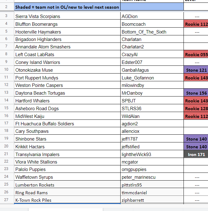 This season, Southpaws and Caspers will be in OL, and are in entry pool now ready for Rookie league next season. I have just completed making sure they both have OL-compliant rosters. Here is the detailed info: id: allenciox team: Cary Southpaws id: milowindby team: Weston Pointe Caspers Those names are placeholders for now until I figure out better long-term names for them (Southpaws are not actually lefties at this point).