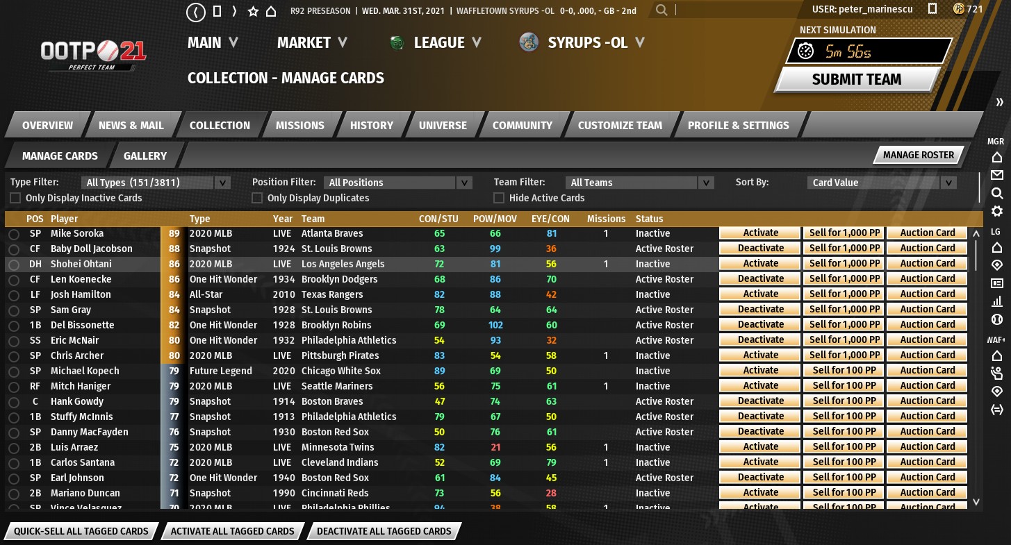 I scanned the OL team rosters just to make sure everyone's was compliant (hey, I'm at home!) and found 3 teams that still have MLB 2020 players on their rosters. Please update your rosters! palolo 1b Jose Martinez sierra vista 3b Jedd Gyorko waffletown rf Shohei Ohtani |