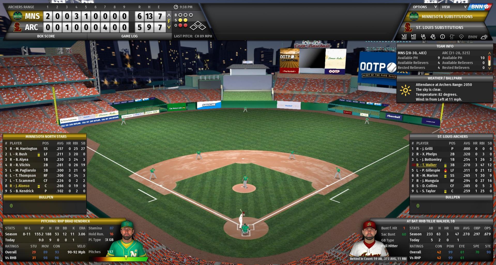 There should have been at least one more pitch present for Vilchis's at-bat, seeing as the ball actually landed in foul territory untouched without Walker within sufficient fielding range of it at the time, but there wasn't. Ultimately, that gave Minnesota enough of a scoring margin that the Archers couldn't tie the score later on. Only one run should have scored in the inning, most likely, as a result, even with the errors listed for the Archers in the inning. I don't really know how to get or to show you the applicable coding error thing here, unfortunately, so my game log and the box score will probably have to suffice, at least for now, in regards to this game. But hopefully, this will still help, somehow, in any case. Archers Range is a renamed version of one of the Busch Stadiums, I believe, if that helps. 1995 Busch, if I'm not too mistaken here, at that? If anyone can help here, I'd be most appreciative. Thank you. CD out. Postscript: Game semi-managed through OOTP 20, by the way. CD out.