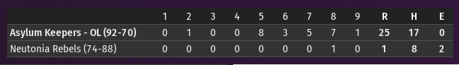 Actually took it a step further, especially in light of how I chased a certain collection. I removed all temptation by selling off all the lives from from Port Ruppert except the iron, and all except the silver for Asylum. When Terra Incognita joins the fold next week, they'll only retain live bronze. I also will be deactivating the OL cards above 40, as soon as I have Asylum ready to go. It just makes it cleaner to look at and helps my tired brain. I will again keep the three rosters unique. So far the only conflict was Asylum having to sell a gold Bronson Arroyo, who already is on the Mundys staff. I've attached a line score of the Asylum Keepers last non-compliant game. Not only did they do all the amazing packing I detailed earlier, in game 162, they left a 3000+ PP present. |