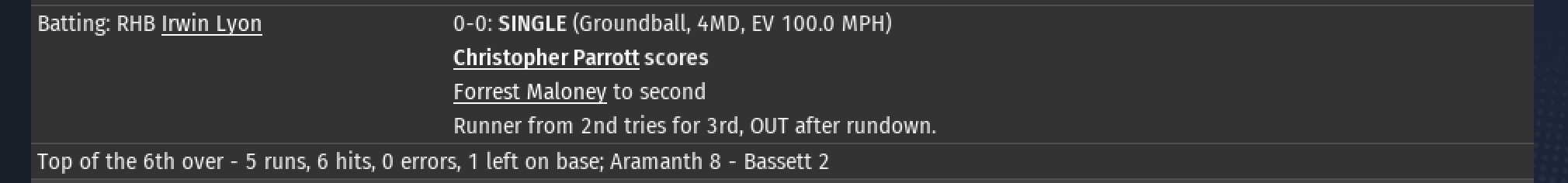 ![]() PBP never mentions who was out and why. Apparently runner on 1st got caught in a rundown attempting for 3rd but was not illustrated or reflected in PBP. **/R21.1667/R15.1667/L15.3000/R23.2000/R18.9000/R24.5667/L24.0000/R26.2333/L23.0333/R29.0667/30.5333/0/26.5667/0/0/\ 23, .0000, , 1/, , -1.0000/2/ 14, .0000, 0/, 2/3/, , 809/.5000/3/1/0/.0000/ 1, -1.1111, 1/, 25/, , 4/-0.1747/.0000/2.1504/-1/6/0/0/1.0000/ 3, -1.1111, 1/, 4/5/7/8/9/11/12/13/15/17/18/19/20/22/23/, , 3.4000/.8500/.0000/.0000/-0.0957/78/0/809/1.0000/ 14, -0.5000, 3/, 6/, , 310/2.0000/12/1/0/.0000/ 14, -0.5000, 3/, , , 1010/2.0000/41/1/0/.0000/ 0, .1000, 4/, 10/, , 7, .0000, 3/, 21/25/25/, , 10/50/25/10.0000/168.6000/.0000/.0865/.9017/.4000/0/100/0/0/0/ 18, .0000, 3/, 25/, 7/, 6/1/1/0/ 18, .0000, 3/, 15/, 7/, 8/1/0/0/ 2, .0000, 6/, , , 12/1/2/0/1/.0000/ 2, .0000, 3/, , , 13/2/2/0/1/.0000/ 2, .0000, 3/, 24/, , 15/0/2/0/0/.0000/ 1, .2500, 3/, 14/, , 5/.0000/.0000/.0000/106/0/0/0/.0000/ 12, .0000, 13/, 25/, 7/, 5/-1/.1000/ 1, .2500, 3/9/, 16/, , 8/.0000/.0000/.0000/107/0/0/0/.0000/ 12, .0000, 15/, 25/, 7/, 8/-1/.1000/ 1, .2500, 3/, 25/, , 7/.0000/.0000/.0000/108/0/0/0/.0000/ 14, .5000, 3/, , , 31/.0000/4/1/0/.0000/ 18, 1.0000, 3/, 25/, 7/, 3/1/0/0/ 18, .5000, 3/, 25/, 7/21/, 9/1/0/0/ 20, .0000, 7/, , , 1/ 18, .5000, 3/, 25/, 7/21/, 11/1/0/0/ 23, .0000, 3/, , 27/, 999.0000/3/ 1, .4000, 12/, , , 15/.0865/.9017/-1.0000/109/1/0/0/1.0000/ 0, 1.0000, 19/2/14/8/17/16/20/7/22/7/, 26/27/, 10/11/3/24/, 11, .0000, 25/, , , 1/1/ 23, .0000, 25/, , , -1.0000/51/ |