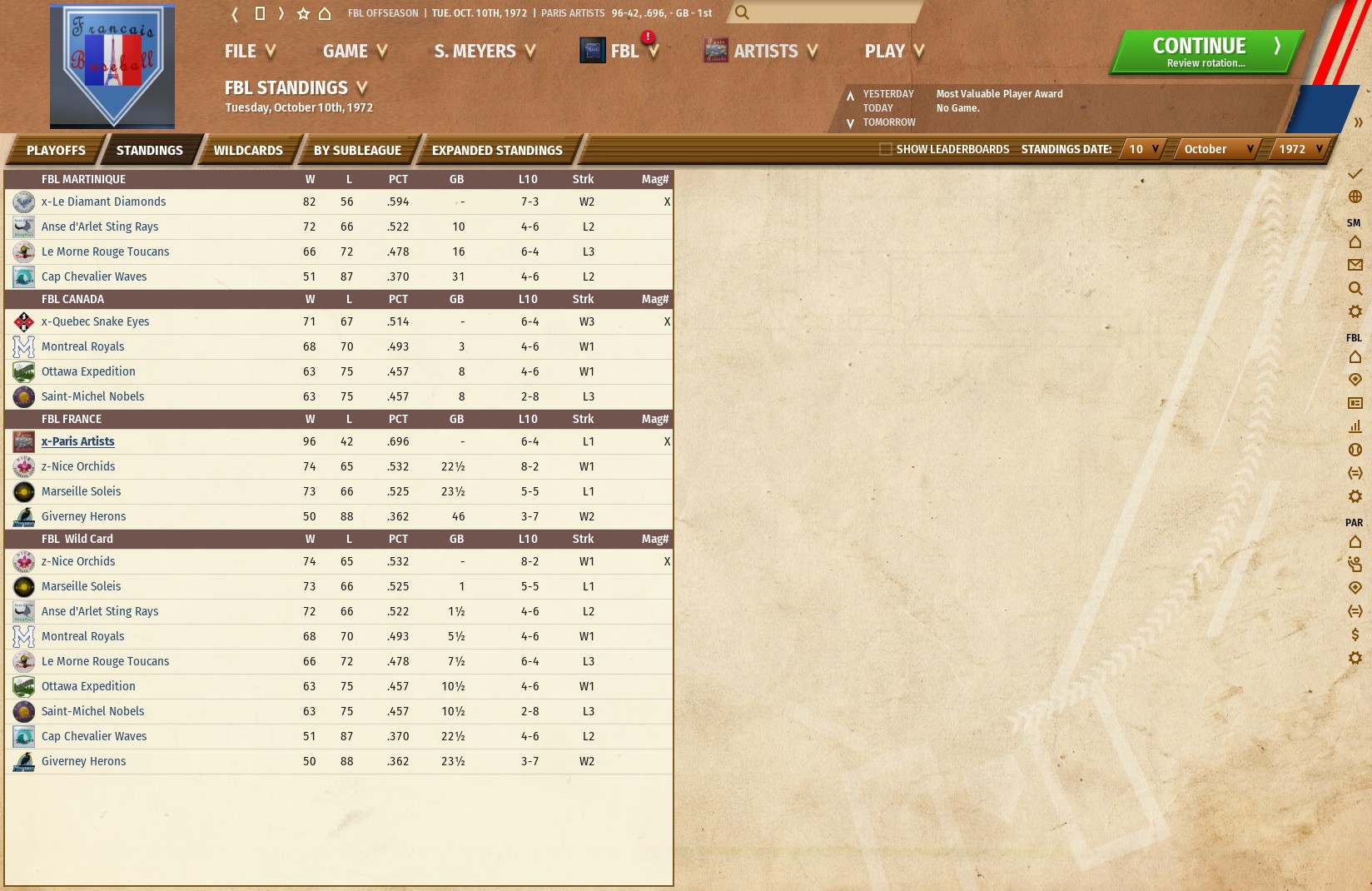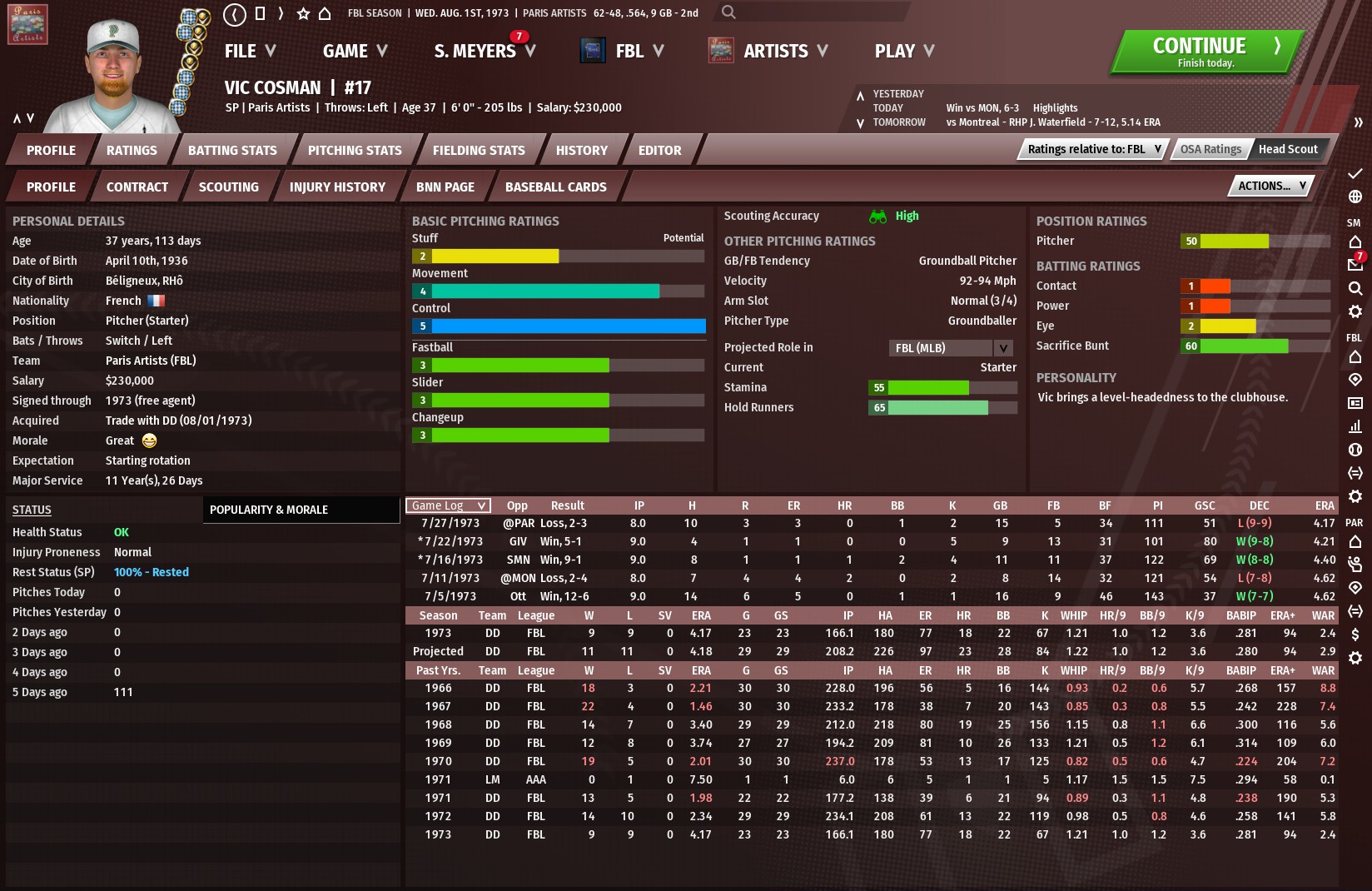 Nice has emerged as the favorite with Marseille and Paris both a distant second. The Artists clearly are not dominating the league like they once did. Our main character Julien Henri is having a good season but his 8-8 record speaks to some struggles on the hill. Henri has never had a losing season as a pitcher. But, more important than that, Julien wants to avenge the post-season when they lost the title to Le Diamant.