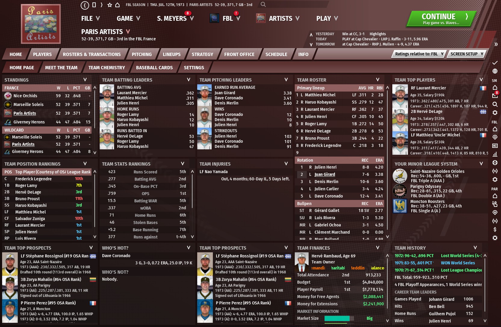 Nice has emerged as the favorite with Marseille and Paris both a distant second. The Artists clearly are not dominating the league like they once did. Our main character Julien Henri is having a good season but his 8-8 record speaks to some struggles on the hill. Henri has never had a losing season as a pitcher. But, more important than that, Julien wants to avenge the post-season when they lost the title to Le Diamant.