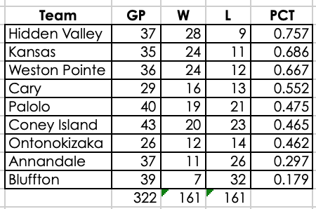 Remaining OL schedules for the top three: Hidden Valley 12: nine vs. Annadale, three vs. the Puppies. Kansas 6: three vs. Annadale, three vs. Bluffton Weston Pointe 6: All six vs. Cary In Bronze league play: In the NC: Both Weston Pointe and Kansas are two games off the division and currently hold down both wildcard spots. An 18-8 August by Carnegie Hill has them 4 games behind Weston Pointe for the final wildcard spot with Humbolt 4.5 off the pace. In the AC: Hidden Valley has a lock on the first wildcard spot. With a good final month the Puppies are the only other team that has a shot, 4.5 games off the second WC but they have two teams in front of them. For everyone else its playing out the string. |
