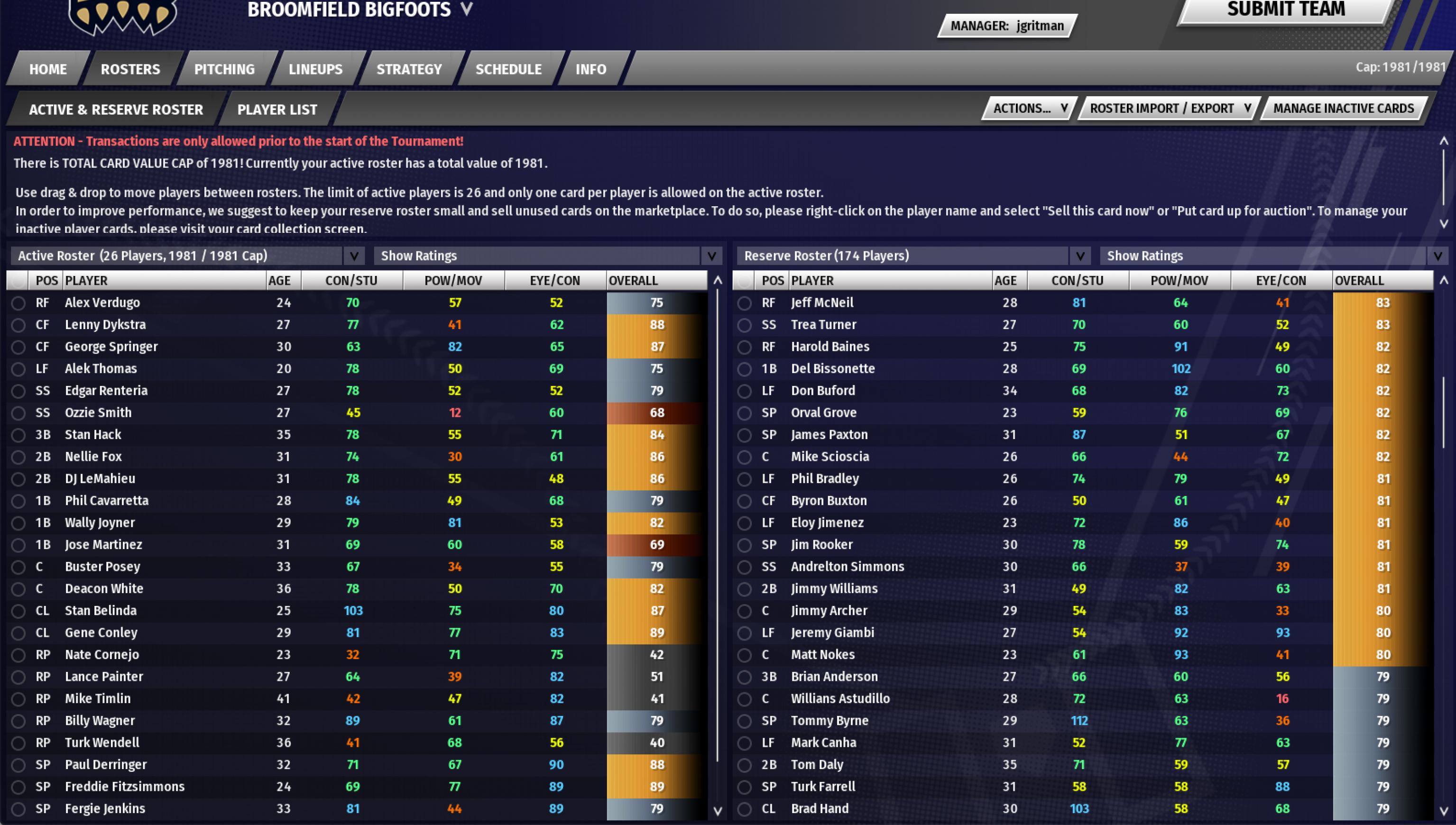 I prepared my roster ahead of the tournament and it was definitely at the cap. I checked again after I got the ready to go notification, and it was reset to the AI created lineup. I reloaded from my export, but it reverted again to the AI roster once the games started. (Also note that the import took two tries to show up correctly. The first time only a handful of players were added to the active roster). I'm guessing maybe the AI thinks my roster was above the cap? Though I've had other non-cap tournament rosters go wonky before too with the same workflow. At least if the roster is invalid maybe the server could remove a card instead of resetting the whole thing? It's frustrating (to put it mildly) putting half an hour into figuring out who to play and setting player strategies only to see it not show up at all. (not to mention having that tournament slot blocked while waiting). I've attached my roster screen as it looked before the tournament started. Let me know if I can provide any other information to help! |