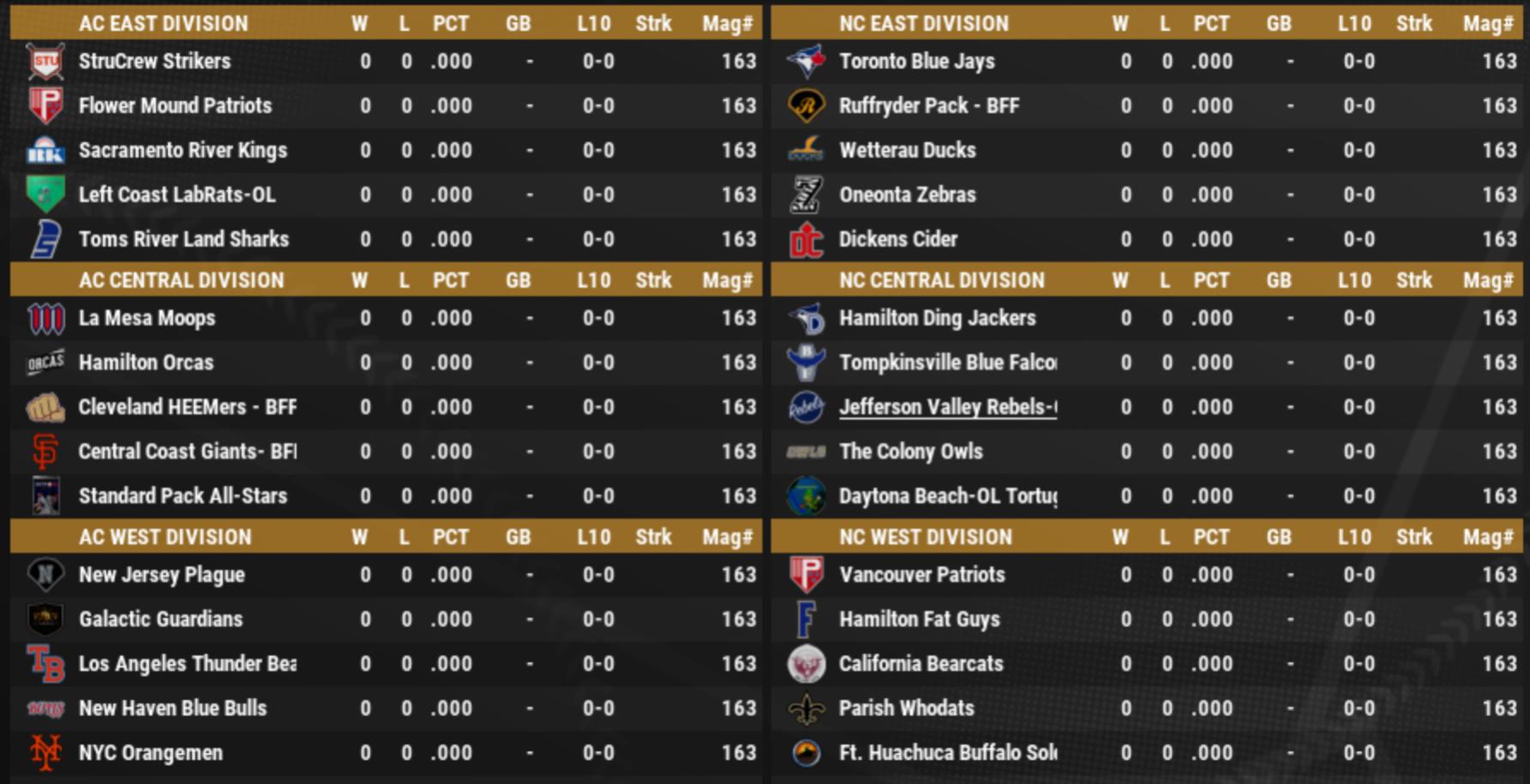 it would be fine if someone wants to grab one of them. I forget which league, but one of them was perfect, with the OL teams spread so that we could get all the playoff spots. One really sucked, with four teams in one divsion and the Southpaws as an outlier. The other was, meh. The good one proves that it can be done. I just wish it was the standard.