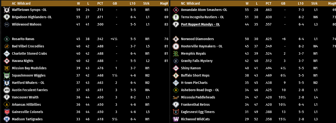 I've also attached the wild card standings here. I didn't get to check in much yesterday and was kind of shocked to see my Rustlers streaking. A closer look revealed the reason - no OL games. |