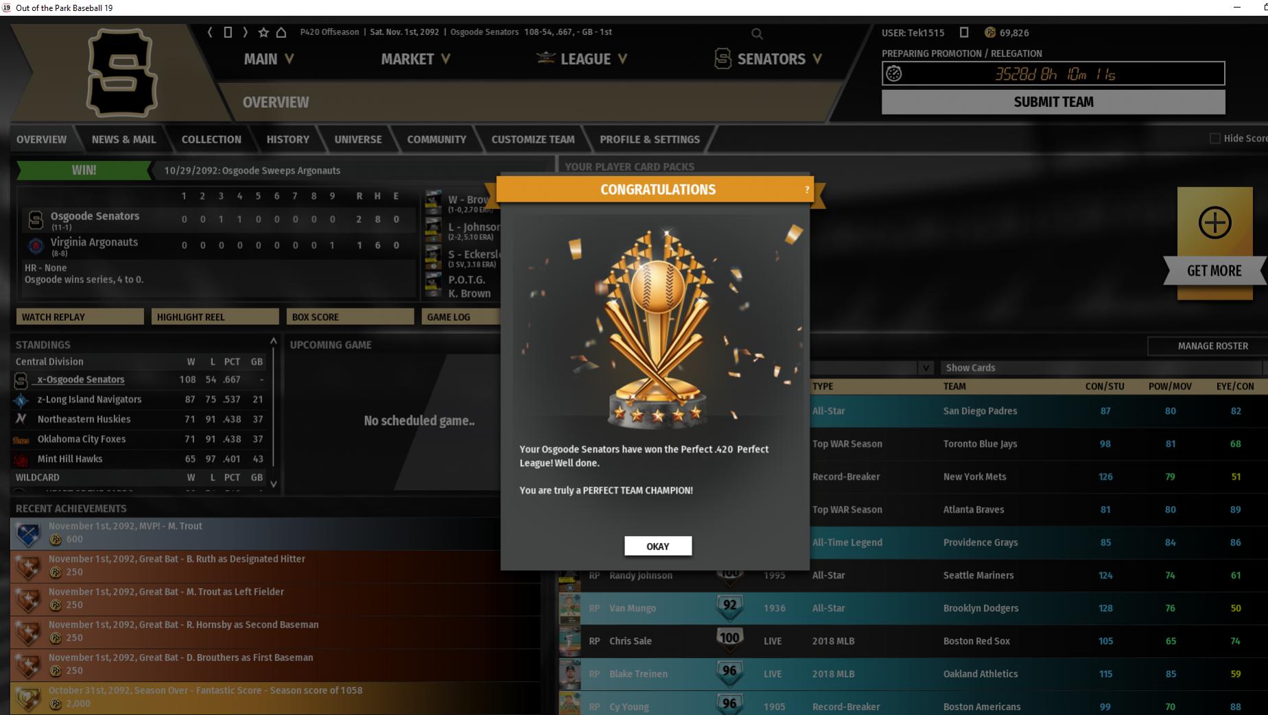 For the second time in the last month it almost happened, but sadly my third team blew a 3-1 lead in the WS to lose my final season Perfect League trifecta dream. Proud of my main squad, who after a later start to Perfect Team than many top teams managed to capture 15 championships and rank inside the top 15 all time winning percentage in Perfect Leagues.
