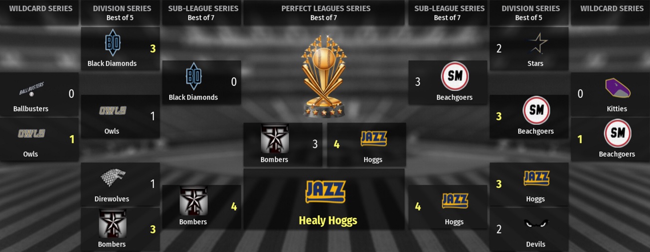 We limped into the postseason, winning our division 84-78 to make the Perfect League playoffs for only the 5th time. We'd made it the last two seasons with significantly better records (111-51 & 94-68 respectively) only to lose in the Division Series both years. It looked like that was going to happen again for this final season, as we fell behind the Manchester Devils 0-2. Then, somehow, we won both games at home, the second via a walkoff Ron Santo 3-run dinger in the bottom of the 13th. Back in Manchester's house for Game 5 we took the lead in the 7th and added some insurance in the 9th to win 5-2 and take the series. Next up were 3-time champs the Santa Monica Beachgoers, who'd been at Perfect Level since 2030 and were making their 37th trip to the postseason. They beat us 11-2 in Game 1. We came back to win the next 3. But they wouldn't give up so easily, taking Game 5 and 6 to force a decider. A brawl in the 3rd inning sparked by our Cleon Jones and their Warren Spahn showed just how much winning meant to both teams. But it would be our day, Mookie Betts, J.D. Martinez (a lefty-hitting specialist), Yogi Berra, and Bobby Murcer (who replaced Jones after his ejection) all going deep in a 7-3 win. The Hoggs were off to the World Series for the first time. On the other side of the card were the Blake Street Bombers, also yet to win a Perfect League series after 13 previous postseason visits. They resembled the Hoggs in many ways - inaugural 2019 teams, stuck for quite some time in that 'too good for diamond but not good enough for Perfect' purgatory. They'd been up at Perfect Level uninterrupted since 2056, while the Hoggs had been up without relegation since 2063. Whoever won this series would be first-time Perfect Champs at the last opportunity. The Bombers were clearly the better team, finishing the regular season 100-62 (the exact same record they'd posted each of the last 2 seasons). They'd scored the second-most runs in their conference while conceding the third-least. By comparison, the Hoggs had only scored the 7th-most runs on their side of the league, while conceding the 7th-most. And sure enough, the Bombers demonstrated their superiority early, easing to victory in both games of their opening home set. But we had fight about us, as demonstrated by our path to the series. We won Game 3 7-6 via a walk-off sac-fly in the bottom of the 9th. Another brawl marked this game, their Todd Helton taking offense to our Cy Young beaning him and charging the mound. Our Spahn threw a complete game in Game 4, allowing just 1 run, while we scored 5 to tie the series back up. Game 5 was tight. We managed 14 hits and 2 walks but squandered scoring opportunity after scoring opportunity. Still, we did enough to hold on, winning 3-2. Suddenly the Hoggs were 1 game away from a first-ever Perfect Series victory. We took a 3-0 lead into the bottom of the 8th of Game 6. We seemed to be cruising and in control. In the 4th we pulled off a TRIPLE PLAY, Todd Helton lining out to right with 2 on, both runners taking off and unable to return to base in time. 9-6-3 triple play yo! But then we got the jitters. With 2 outs in the 8th, Ron Santo fluffed a routine play to first, firing the ball into the stands. That woke up the Bombers' offense and they went on to pile on 5 runs, going on to win 5-3. Momentum had swung, right? It certainly seemed that way when the Bombers put runners on the corners in the bottom of the 1st of the decider. But the Hoggs held them off, and got on the board in the 2nd, Santo atoning for his game-changing Game 6 error with an RBI-triple. The game stayed tight, our Cy Young duking it out with their John Smoltz. We got to Smoltz again in the 5th, scoring 2 to take a 3-0 lead. Cy Young kept rocking, and came out to pitch in the bottom of the 7th after our Aparicio walked, stole 2nd and scored off a Lefty O'Doul single in the top of the inning. Once again, the Bombers put runners on the corners but once again Young held firm, though he looked a bit worried when Phil Rizzuto hit a booming fly to center. Garry Maddox tracked it back to the wall and took the catch and the inning was over. Young completed the 8th on just 9 pitches, and having thrown only 101 pitches for the game, came out for the 9th. Larry Walker ground out 4-3. Helton hit a soft fly to right for the second out. Jacoby Ellsbury singled. All eyes turned to the dugout. Nobody moved. Young would stay on the mound for at least one more hitter. With the count 1-2, Darren Daulton fouled off a few, trying desperately to stay alive. It was a high heater which got him. Swing and miss and Cy Young had thrown a complete game shutout to win Game 7 and give the Hoggs their first ever Perfect League World Series victory. What a way to finish!