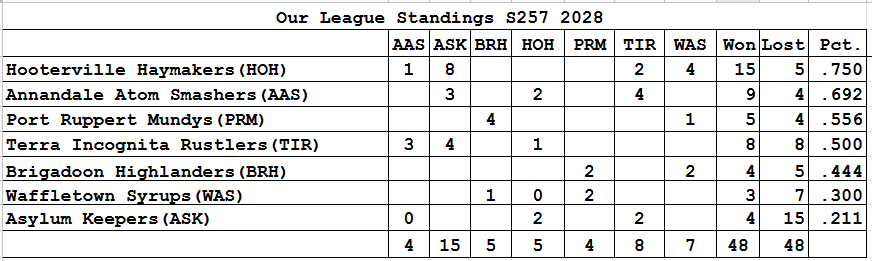 Despite their owner's previous comments Hooterville appeared to be in decidedly under its head as they left the Keepers reeling and punch drunk while they streaked to a dominating lead in OL S257. By the way, the previous standings may have had a few stray games left over from last week, since I reuse them each week. It's been fixed.