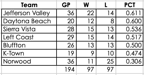 In Bronze play Left Coast and Sierra Vista are in a dead heat a top the AC East. The teams get together for a three games series mid month.
