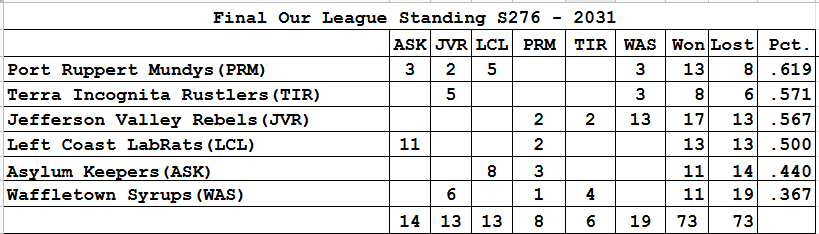 In PT play Asylum won the AC central and Waffletown is in the NC wild card game. Jefferson Valley will be relegated. Left Coast, Port Ruppert and Terra Incognita remain. Whether Asyum or Waffletown is promoted depends on their playoff success. |