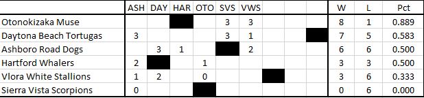 In PT play Weston Pointe has a one game lead in their division with Cary tied for second one game back. Cary and Kansas along with Weston Pointe are in the playoff mix in the NC. In the AC Highland is .5 back in the wildcard race Hamtrack and Hidden Valley are in the relegation zone with Palolo and Coney Island hovering right around relegation. |