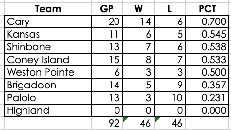 Cary:62 Palolo:57 Kansas:56 Shinbone:40 Weston Pointe: 39 Coney Island: 38 Brigadoon: 36 Highland: 6 |