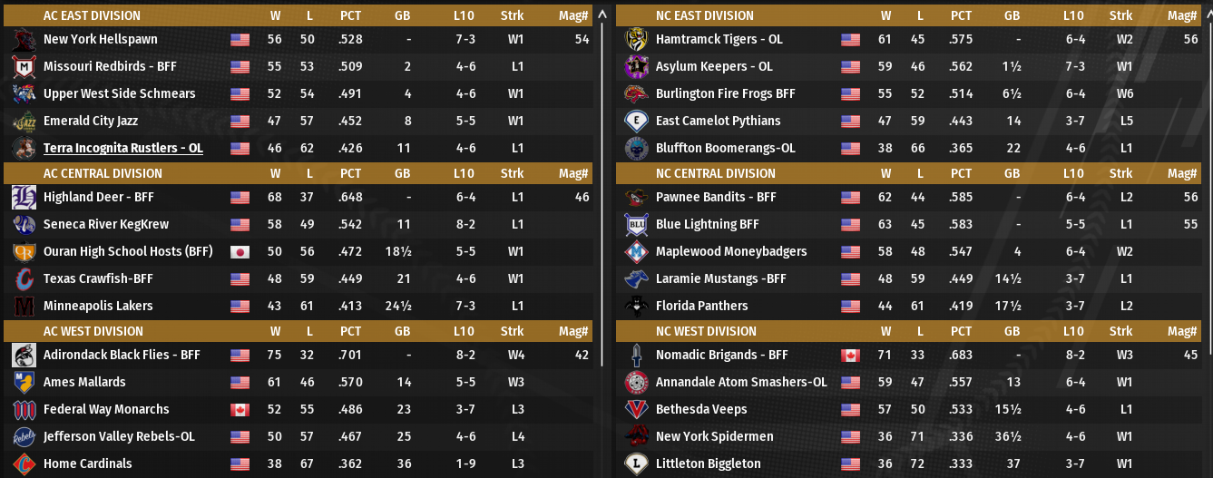 It's a tale of two halves, as Left Coast, Norwood, Ring Road and Ewa Beach sit jumbled atop the OL standings, while K-Town, Waffletown and Port Ruppert appear to be operating under the mistaken belief there is some sort of prize for the worst record ![]() Overall, two OL teams sit in playoff spots early on, with Norwood comfortably atop the AC East division by 9 games, and Waffletown holding down the top wild card position. |