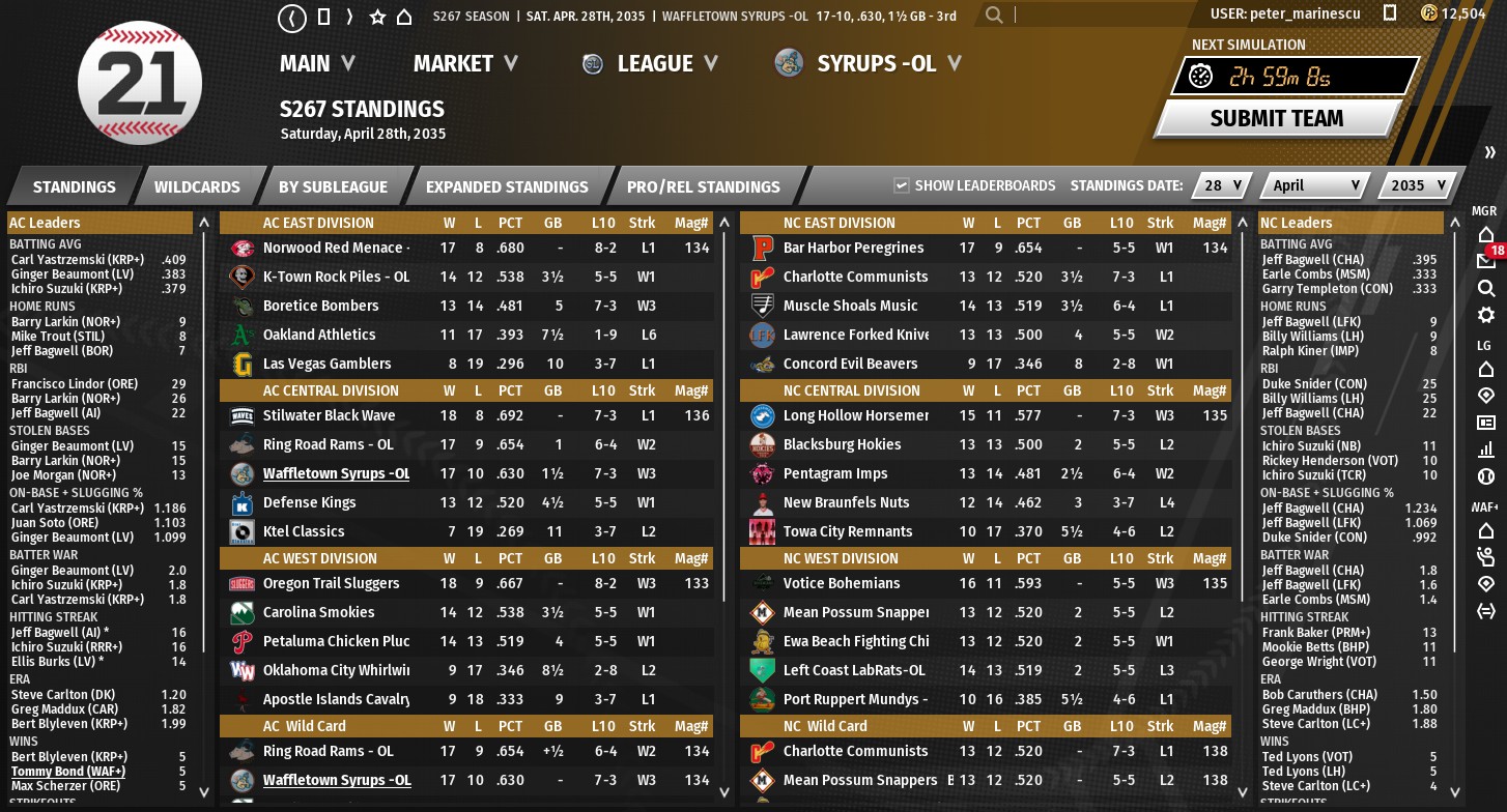 It's a tale of two halves, as Left Coast, Norwood, Ring Road and Ewa Beach sit jumbled atop the OL standings, while K-Town, Waffletown and Port Ruppert appear to be operating under the mistaken belief there is some sort of prize for the worst record ![]() Overall, two OL teams sit in playoff spots early on, with Norwood comfortably atop the AC East division by 9 games, and Waffletown holding down the top wild card position. |