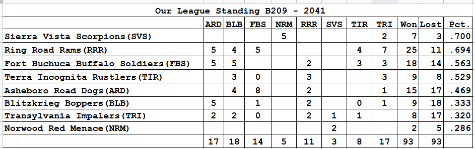 Ring Road remains in the driver's seat, but with a busy schedule for two of their main rivals, Fort Huachuca and Terra Incognita, the race is not over. The Rams magic number is six over the Buffalo Soldiers, with Ring Road having seven left to play, indicative of how wide open the race still is. Even Sierra Vista, which finished it's OL play at .625, remains in the hunt. It should be noted that all of the seven games the Rams have left are with Transylvania, against whom Ring Road is 8-4.